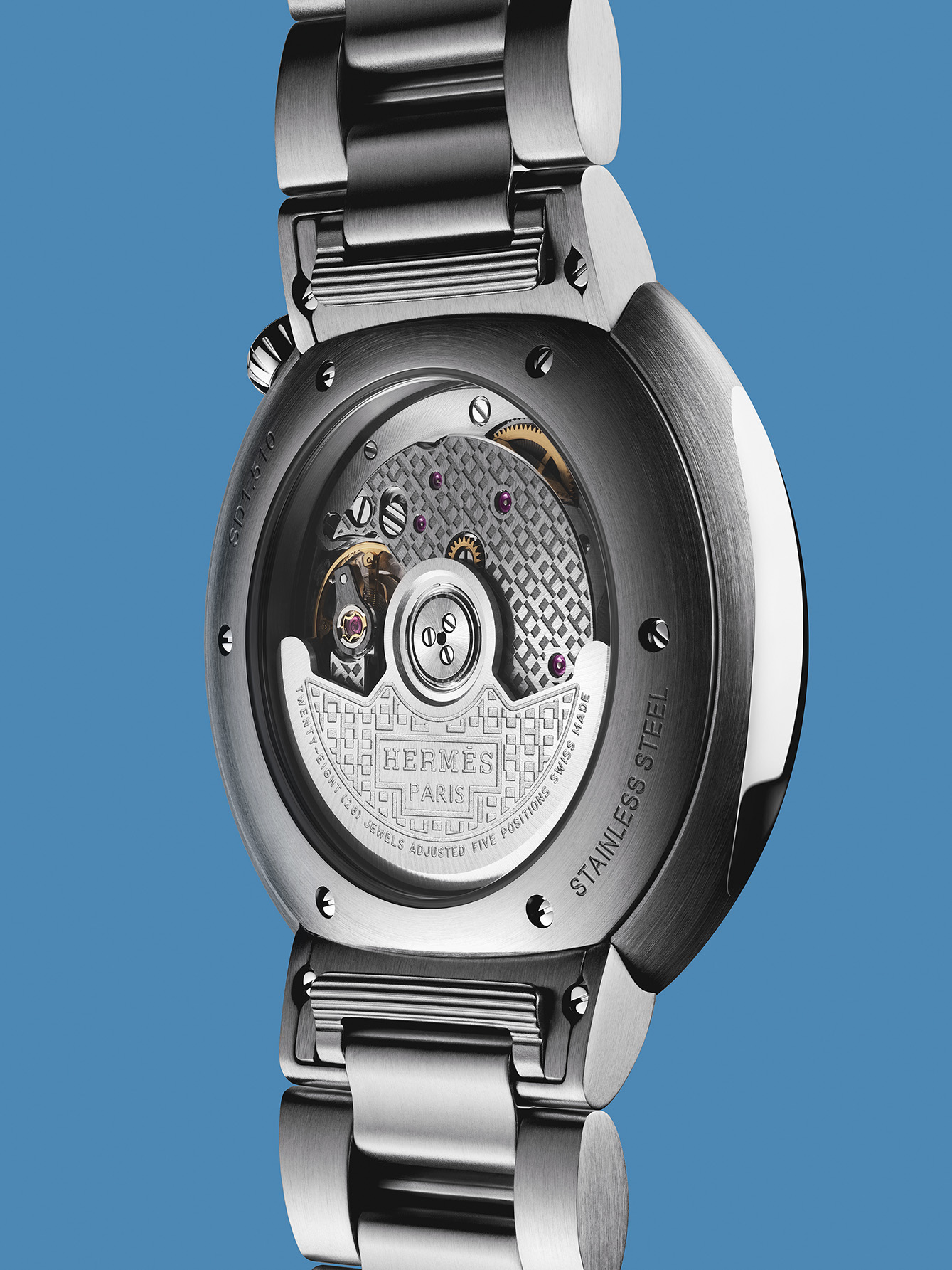 Mesin jam otomatis kaliber Hermès H1912 buatan sendiri memiliki cadangan daya rata-rata 50 jam. Bagian belakang case yang transparan dari kristal safir menampilkan plat utama yang dipoles secara melingkar dan jembatan serta bobot osilasi yang disikat satin. Jarum jam, menit, dan detik yang sebagian terbuka dan mengilap melintas di atas dial jam berwarna perak dengan lintasan menit beraksen abu-abu dan oranye.