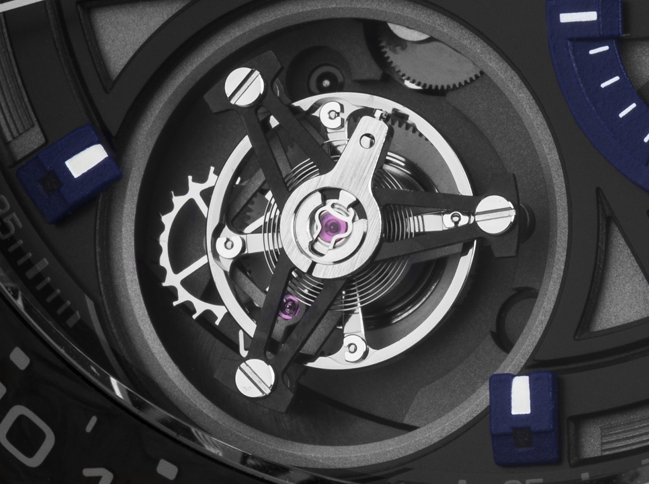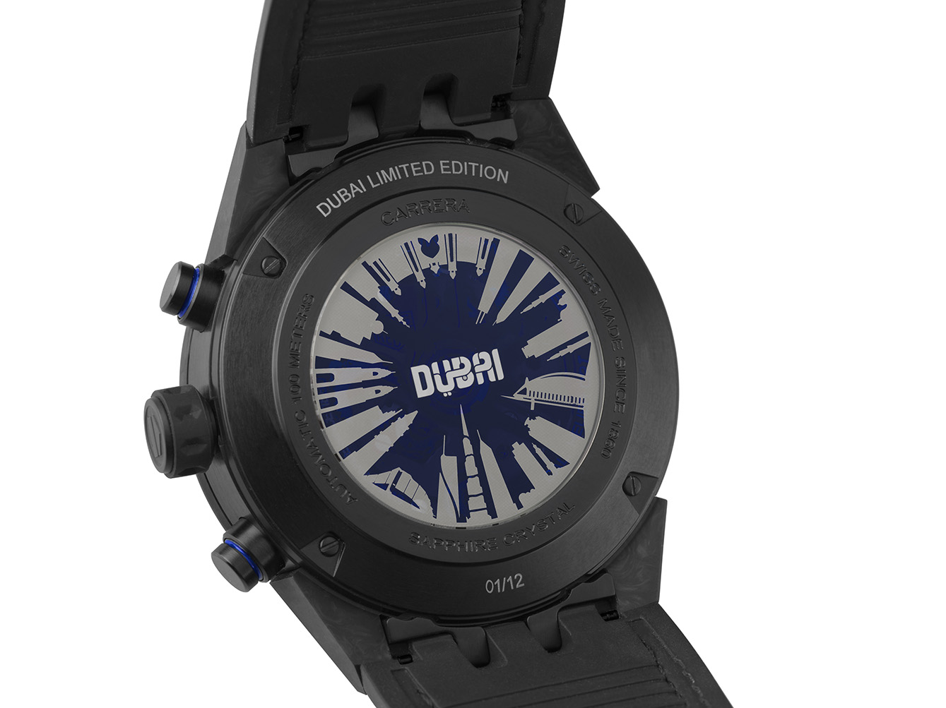 Koleksi edisi terbatas ini memamerkan dial berwarna hitam anthracite dengan dua penanda waktu kronograf, penghitung menit di posisi jam 3 dan penanda jam di posisi jam 9 dengan aksen biru yang kontras. Detil ini melengkapi tourbillon yang berada pada posisi jam 6 dan indeks jam yang juga berwarna biru yang memiliki lapisan Super-Luminova, membuatnya mudah dibaca dalam gelap. Detil khusus di bagian belakang jam edisi khusus ini juga sangat unik, berlapis kaca safir dengan gambar gedung-gedung pencakar langit di Dubai yang berwarna keperakan dan warna biru yang merefleksikan langit di kota mewah tersebut.