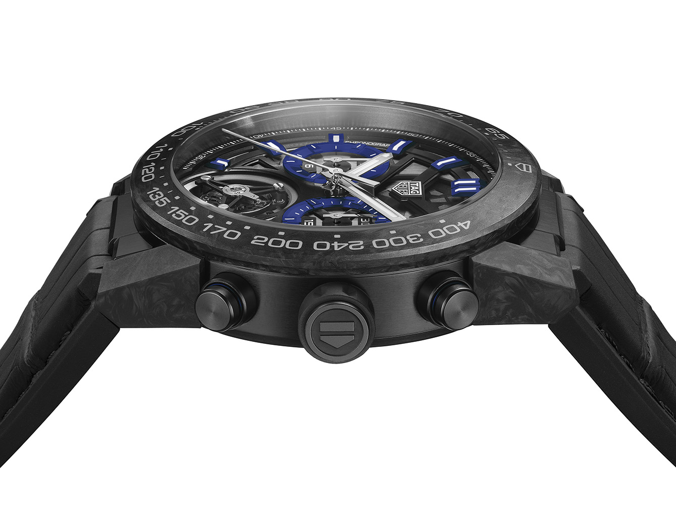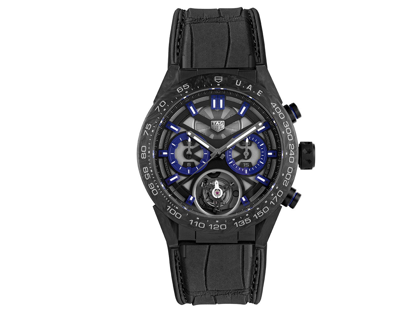 Pada bagian tengah terdapat logo “Dubai” dan nomor seri pada lingkaran luarnya, menandakan bahwa jam ini salah satu dari 12 jam edisi khusus. Selain bagian bezel, lug jam ini juga terbuat dari carbon dan memiliki tombol dan knob yang dilapisi karbit dalam warna biru senada. Jam sporty ini mendapatkan sentuhan yang elegan lewat tali jam kulit buaya berwarna hitam, dipercantik dengan bahan karet yang dijahit di bagian bawahnya, dan dilengkapi dengan pengunci yang juga terbuat dari titanium seperti casing jam, dan dihias dengan emblem TAG Heuer.