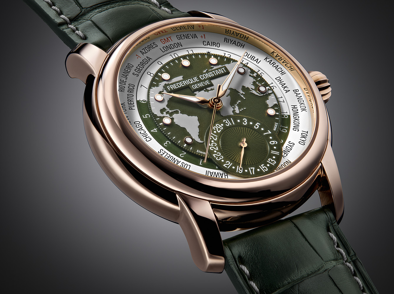 Area dial jam tangan ini memancarkan efek sunburst hijau lembut nan harmonis, dengan peta dunia yang menjadi pusat perhatian. Relief benua yang menonjol memberikan tampilan berdetail tinggi, memisahkan daratan dari lautan dengan sentuhan akhir yang dipoles mengilap. Benua-benua tampak menonjol dengan cahaya yang berubah perlahan sesuai sudut pencahayaan, menciptakan kesan dinamis pada latar hijau yang subur. Pada posisi pukul enam, terdapat jendela tanggal yang menjadi ciri khas Manufacture Frederique Constant. Detailnya mencakup pusat guilloché bermotif sunburst senada peta dunia, yang menonjolkan jarum penunjuk tanggal, serta cincin berefek matte yang memastikan keterbacaan maksimal tanpa pantulan mengganggu. Elemen ini dibingkai dengan ukiran melingkar yang menambah permainan tekstur pada keseluruhan desain. Untuk memastikan kejelasan yang optimal, setiap penanda jam dilapisi dengan Super-LumiNova, sehingga mudah dibaca bahkan dalam kondisi gelap. Detail estetis lainnya adalah kecocokan sempurna antara warna bingkai penanda dengan material case dan jarum jam (emas merah muda atau baja), menciptakan tampilan yang benar-benar serasi. Jarum jamnya yang bercahaya akan bergeser, melintasi dial yang sangat mudah dibaca, berkat tampilan nama dari 24 kota secara lengkap (bukan dalam singkatan seperti yang sering ditemukan pada jam tangan worldtimer lainnya) yang mengelilingi disk 24 jam. Disk ini terbagi menjadi dua bagian: area terang untuk siang hari dan area hijau gelap untuk malam hari. Desain ini menghilangkan kebutuhan akan indikator siang-malam tambahan, sehingga menghasilkan dial yang lebih bersih dan berhasil menambahkan kesan praktis.