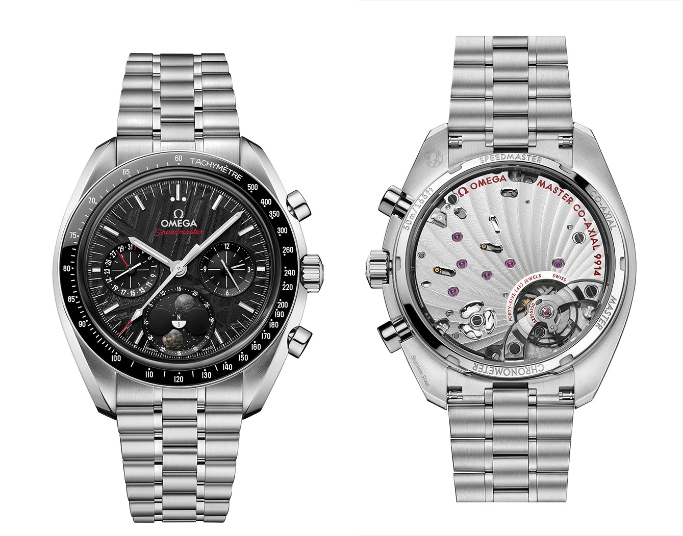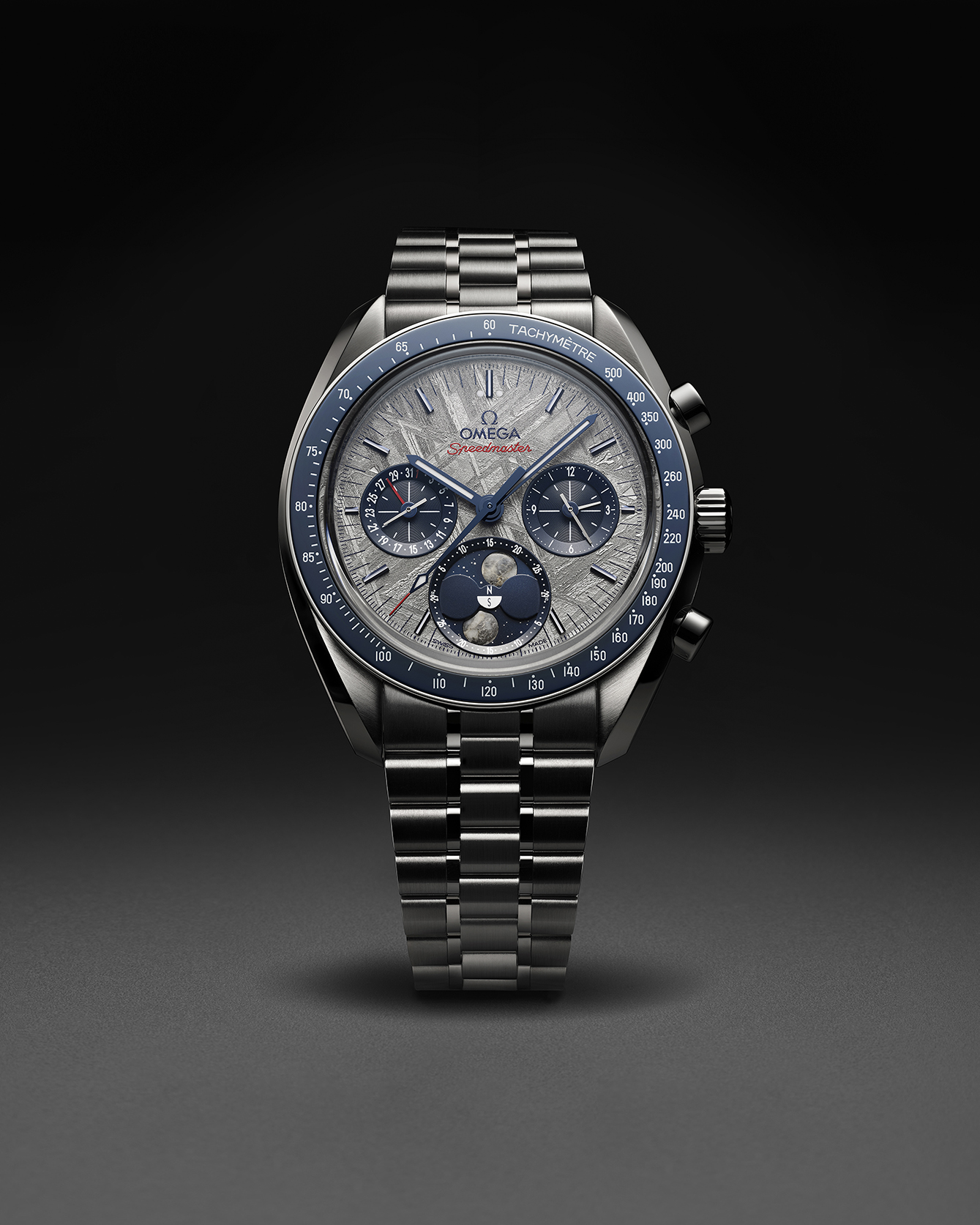 Pada posisi pukul 6, indikasi Moonphase menampilkan dua buah bulan, yang terbuat dari potongan asli meteorit. Ketika berputar, kedua bulan ini memperlihatkan perubahan pencahayaan yang terlihat di belahan bumi utara dan selatan, dan yang lebih luar biasa lagi, bintang-bintang di latar belakang diposisikan persis seperti pada malam ketika Apollo 11 mencapai bulan pada tahun 1969 – sebagaimana dilihat dari rumah pembuatan jam Omega di Bienne, Swiss. Subdial pukul 3 menawarkan pencatat waktu 60 menit dan 12 jam, sementara pada pukul 9, terdapat subdial detik kecil dengan tampilan tanggal yang dilengkapi dengan jarum aluminium anodized merah.