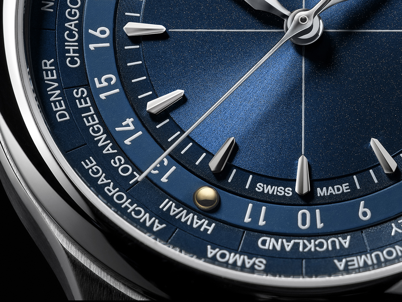 Dial jam yang didesain ulang ini mengutamakan kejelasan dan keterbacaan yang mudah di 24 zona waktu, dengan penghilangan subdial tanggal, memiringkan cakram yang bertuliskan nama-nama kota untuk menambah kedalaman, dan tampilan matahari dan bulan (untuk siang dan malam) yang disederhanakan namun tetap elegan.