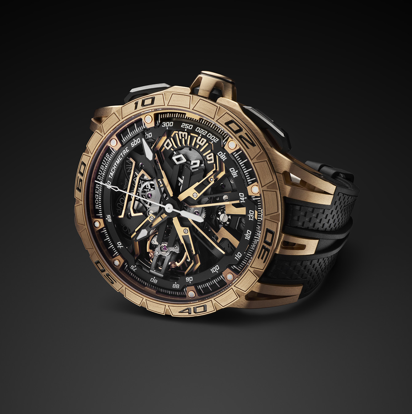 Pelat jam simetrisnya menampilkan harmoni berbagai lapisan dan kedalaman, menciptakan geometri ekspresif yang semakin memukau setiap kali dilihat, sementara rotor berbentuk lima jari menyerupai bagian velg supercar menegaskan hubungan jam tangan ini dengan DNA motorsport kronograf. Hanya 88 buah yang diproduksi, sebuah penghormatan pada angka keberuntungan Roger Dubuis sendiri yang ditandai khusus pada skala tachymeter. Selain menawarkan cadangan daya 72 jam, jam tangan ini telah memenuhi standar bergengsi Poinçon de Genève, yang berarti setiap dari 333 komponennya dihias dengan 16 teknik penyelesaian berbeda. Tidak berhenti di situ, mesin jam RD780 juga menampung dua inovasi yang tengah menunggu paten: Rotating Minute Counter berbentuk isotoxal yang menghadirkan performa visual dinamis melalui tampilan tripartit, serta Second Braking System pada mekanisme kopling vertikal yang memberikan kestabilan lebih pada jarum detik kronograf.