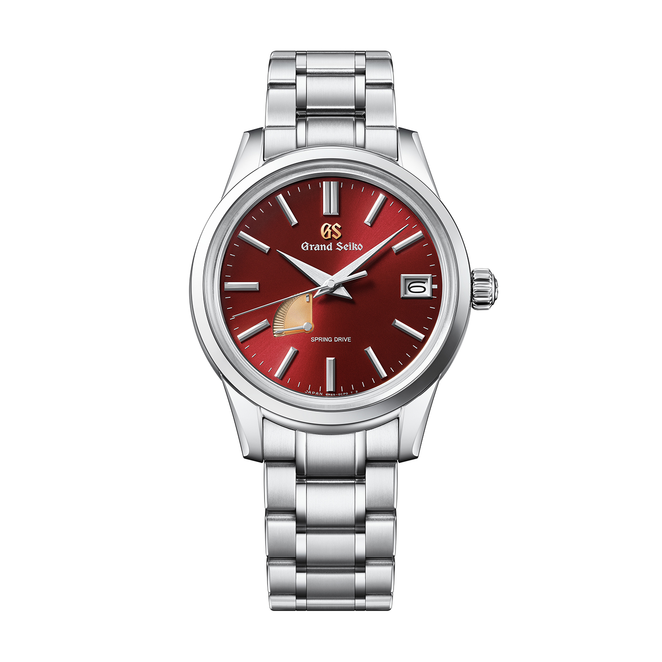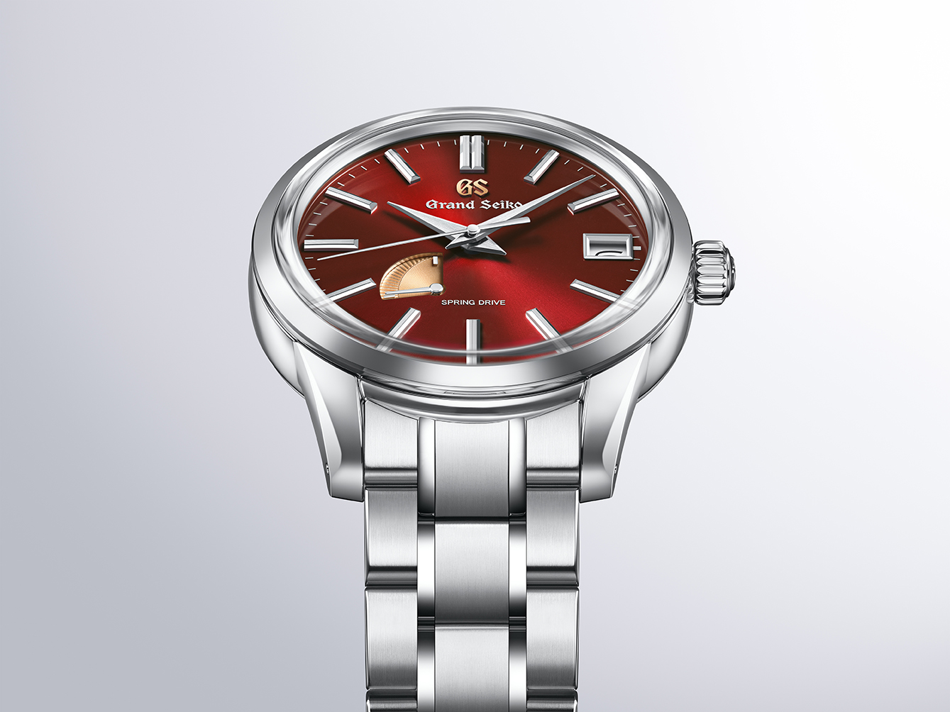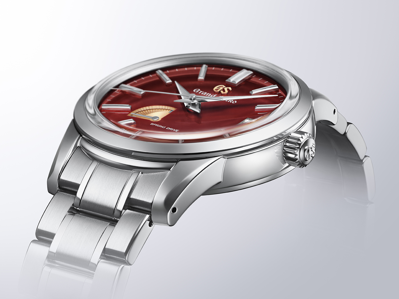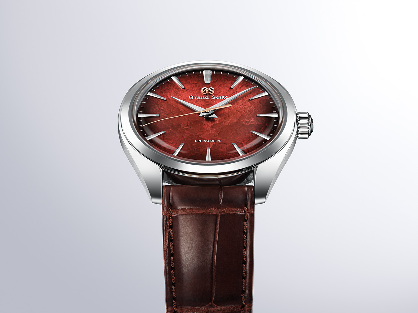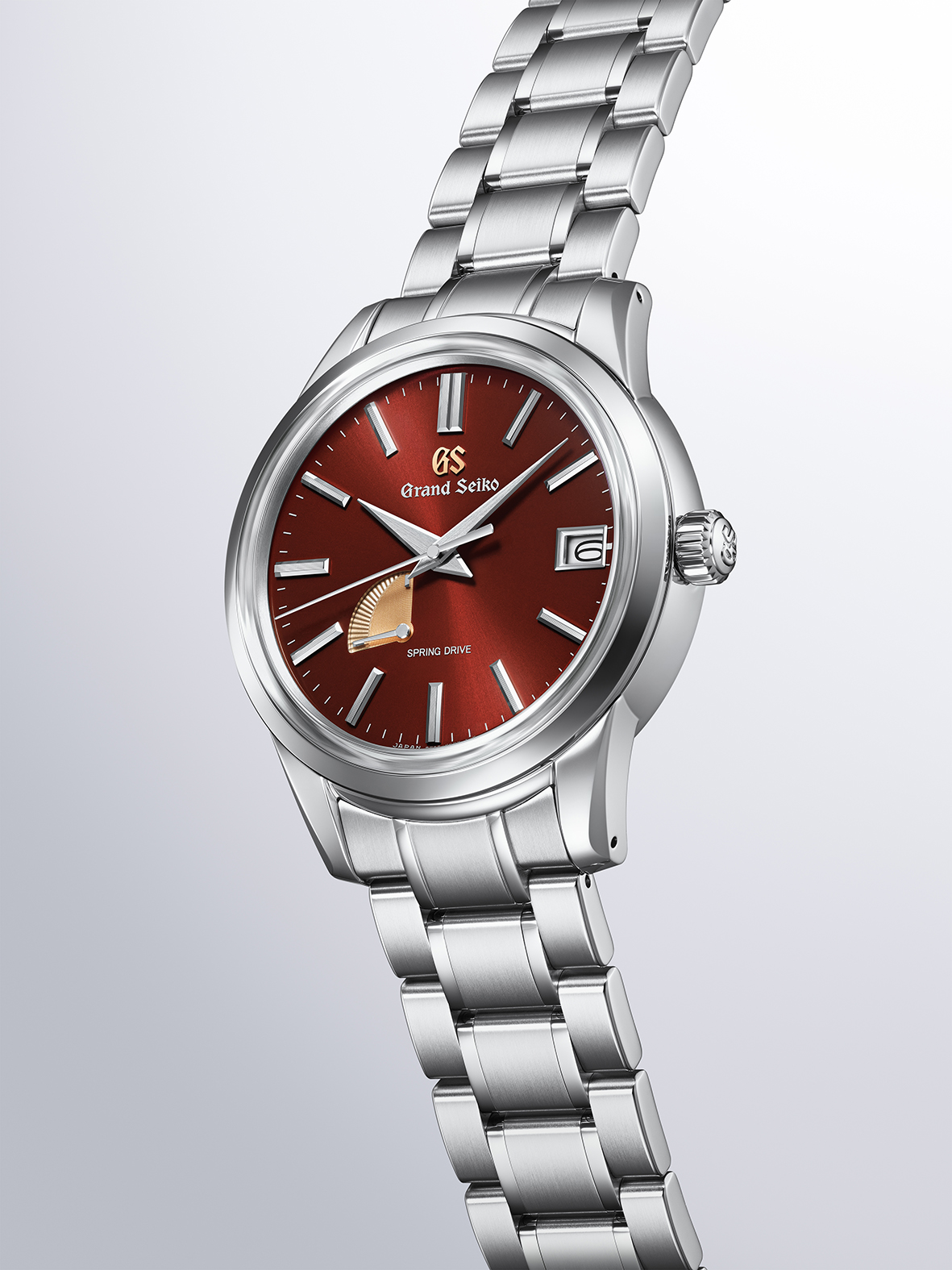 Tekstur yang tergores secara acak disajikan dengan warna merah kecokelatan yang kaya dan dalam dengan efek gradasi yang halus. Memperkuat nuansa musim gugur, jarum detik dan logo GS berwarna emas.