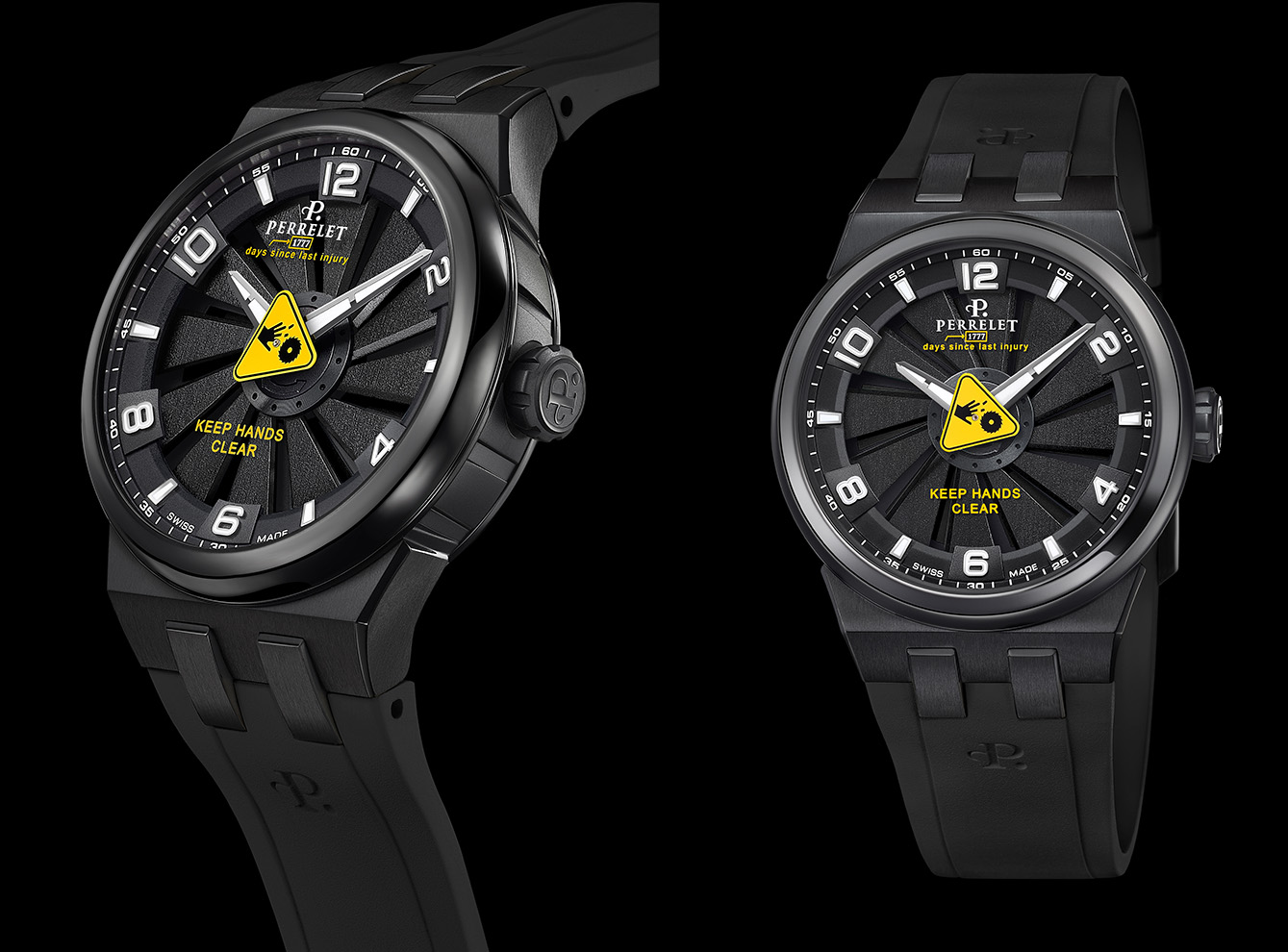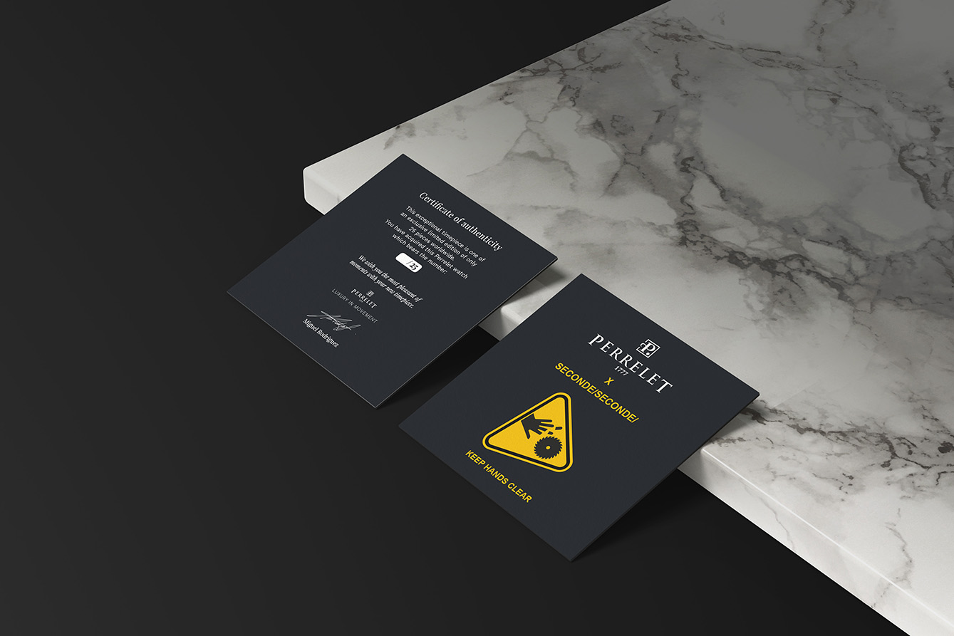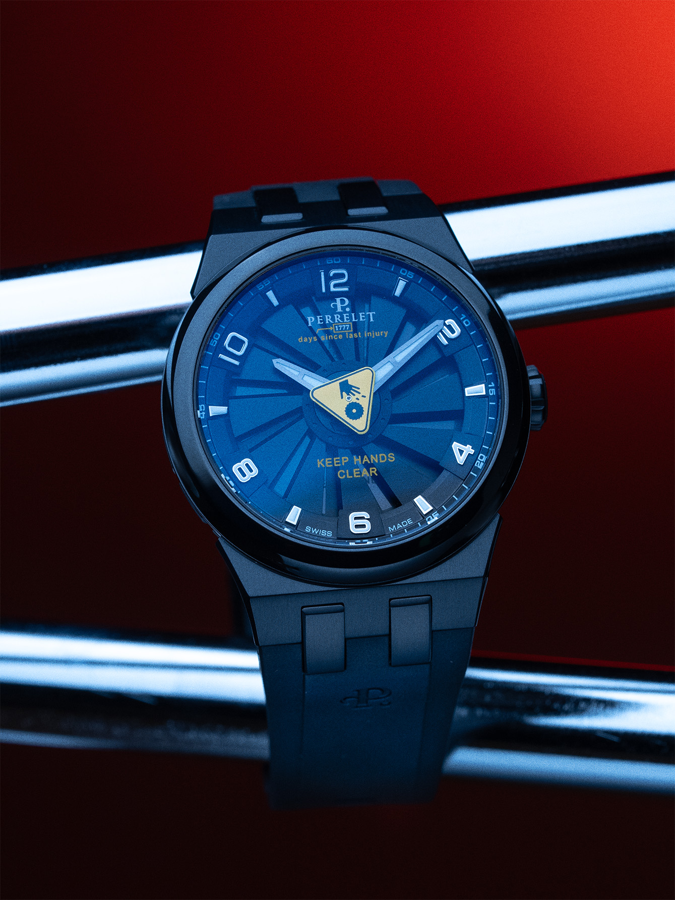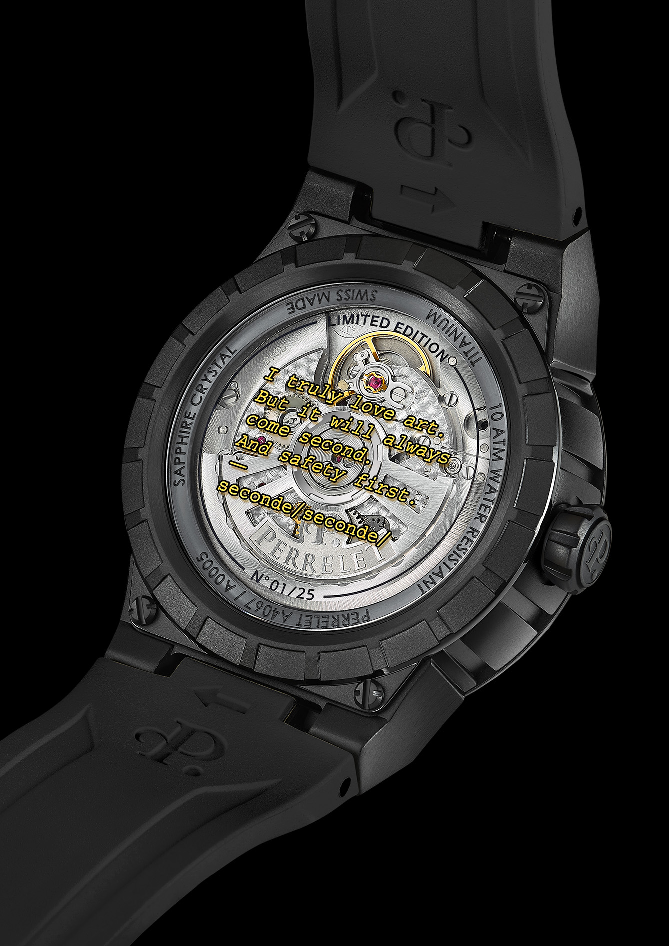 Turut mempermanis sentuhan humornya adalah tulisan “1777 days since last injury” pada dial, yang mengacu pada tahun berdirinya Perrelet. Detail yang memancing senyum ini merupakan ciri khas karya seconde/seconde/, memadukan antara budaya pop dengan sekelumit ironi. Pada bagian belakang case tertuang dedikasi sang seniman: “Saya sangat mencintai seni. Tetapi itu selalu menjadi yang kedua. Yang pertama tetaplah keselamatan.”