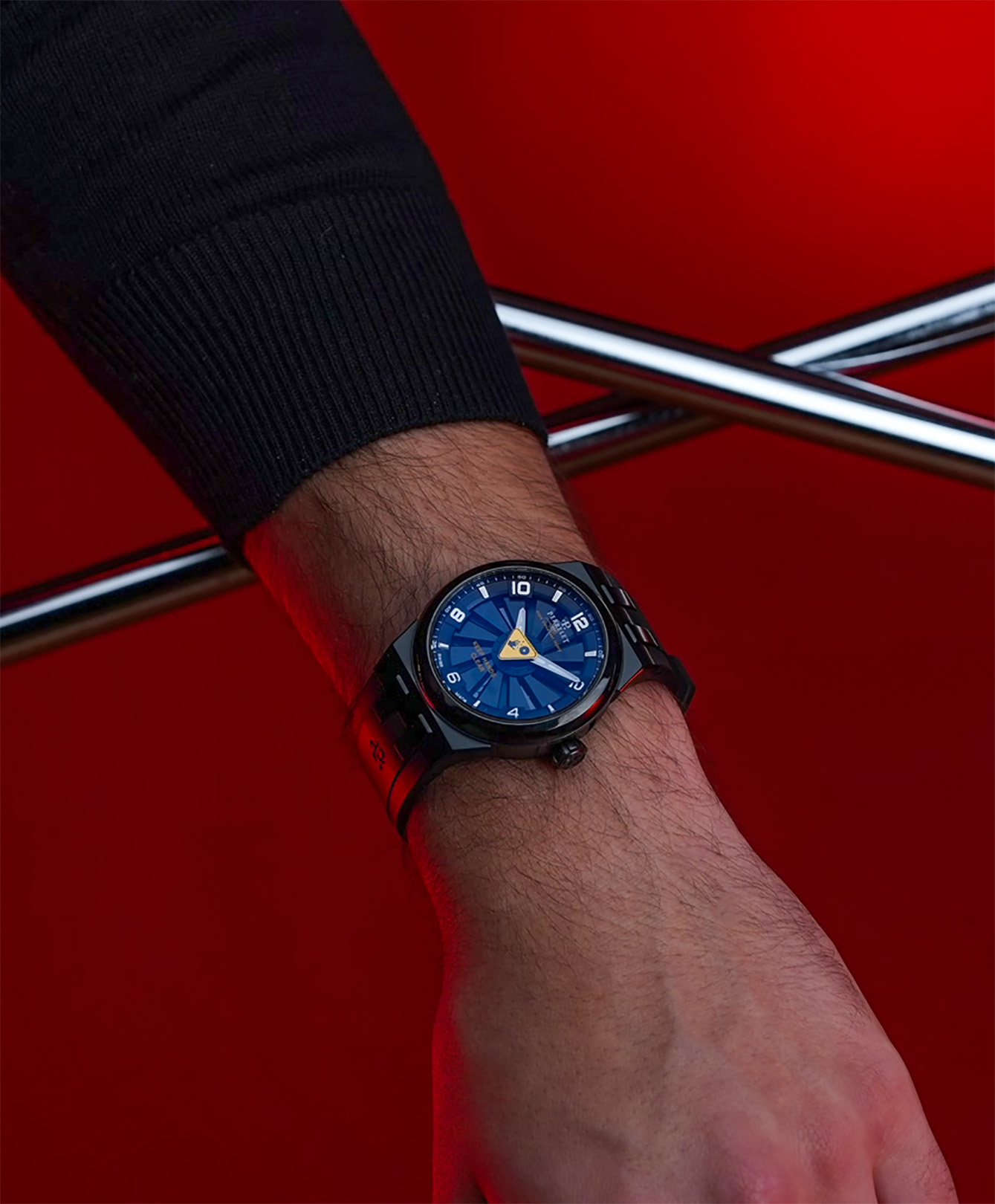 Jarum detik tradisional di bagian tengahnya digantikan dengan segitiga kuning cerah, menyerupai tanda-tanda peringatan “Keep Hands Clear” yang banyak terlihat di area industrial. Konsepnya yang merujuk pada kemungkinan “bahaya” turbin yang berputar seakan mengingatkan bahwa bahkan di dunia kemewahan pun keselamatan adalah yang terutama.