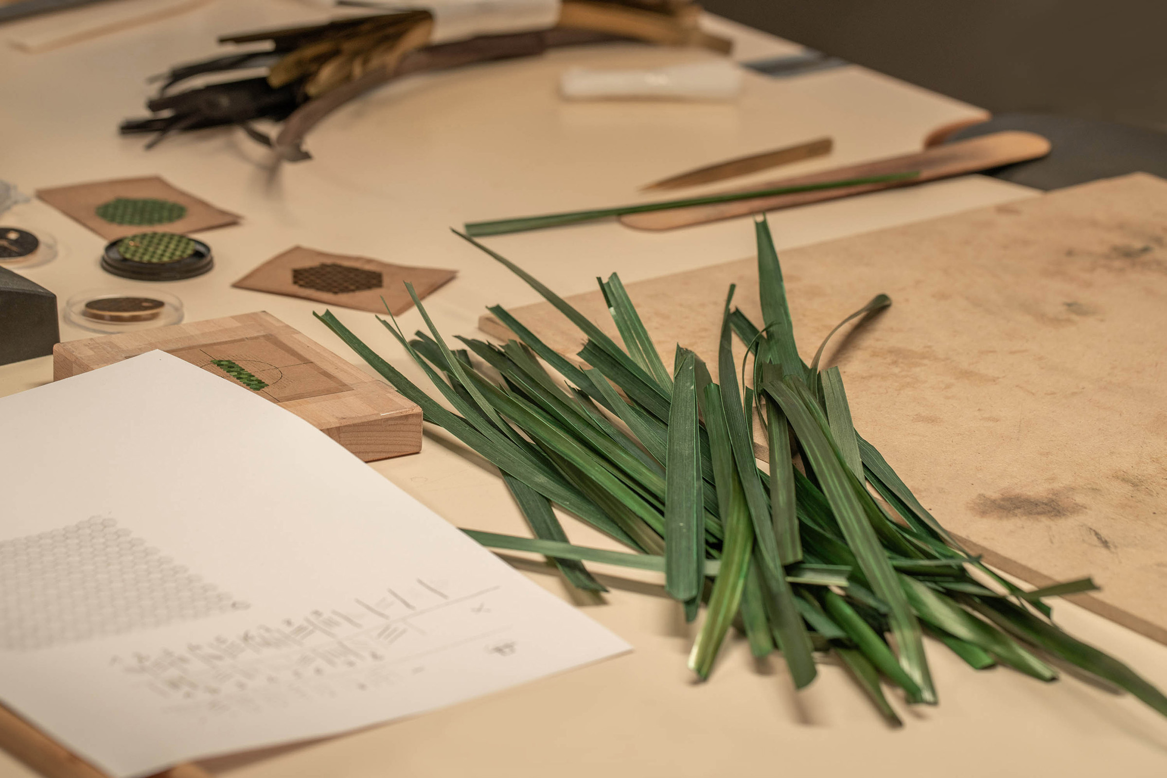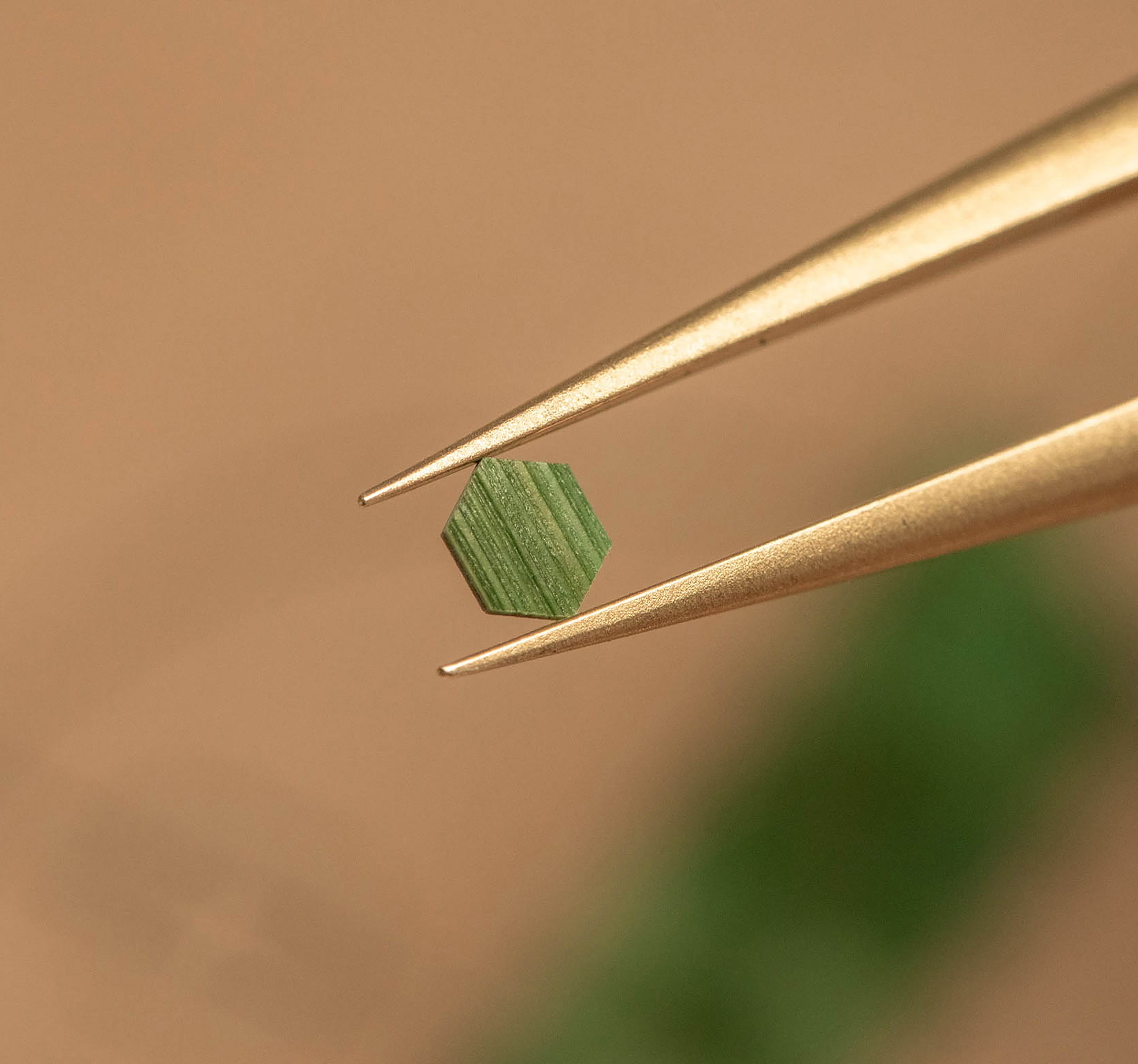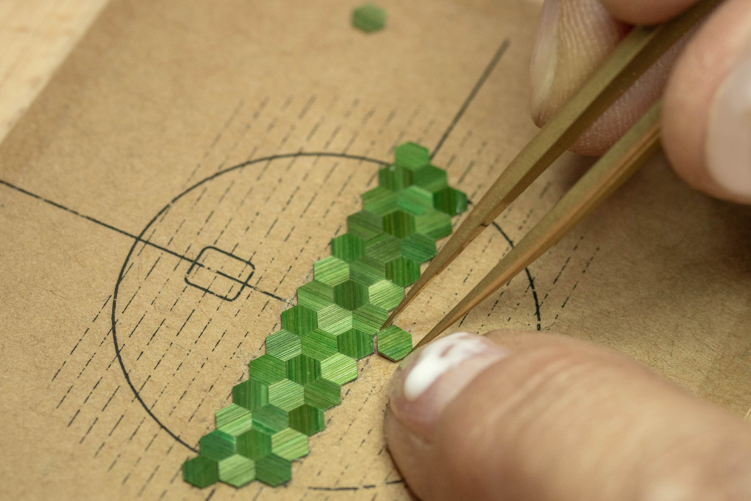 Prosesnya berawal dari jerami gandum yang tumbuh di Burgundy, Prancis, yang dipilih secara khusus, kemudian diwarnai dalam gradasi hijau lembut, yang nantinya bakal menyatu sempurna dengan tali kulit aligator berwarna senada yang dijahit tangan. Setiap helai jerami dibelah dengan kuku, diratakan menggunakan tang, lalu dipotong dalam bentuk heksagonal kecil dengan pisau bedah, dan disusun satu per satu di atas dasar emas merah membentuk motif sarang lebah. Teknik dekorasi yang berasal dari abad ke-17 ini menuntut presisi dan kesabaran ekstrem, menjadikan setiap dial sebagai buah kerajinan tangan yang unik tiada duanya.
