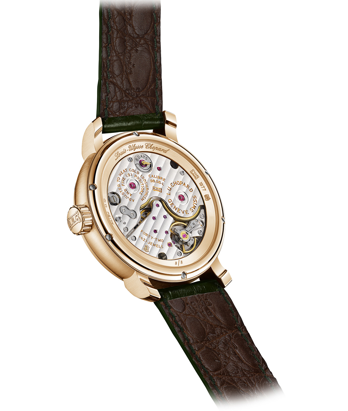 Dimotori mesin jam jumping-hour L.U.C 98.06-L, model berdiameter 40 mm dari emas merah 18 karat ini hadir dengan desain klasik koleksi L.U.C yang elegan dan bersih. Mekanisme jumping hour sendiri, di mana penunjuk jam melompat secara instan setiap satu jam penuh telah terlewatkan, telah lama menjadi impian para kolektor jam karena kerumitan dan daya tarik visualnya.