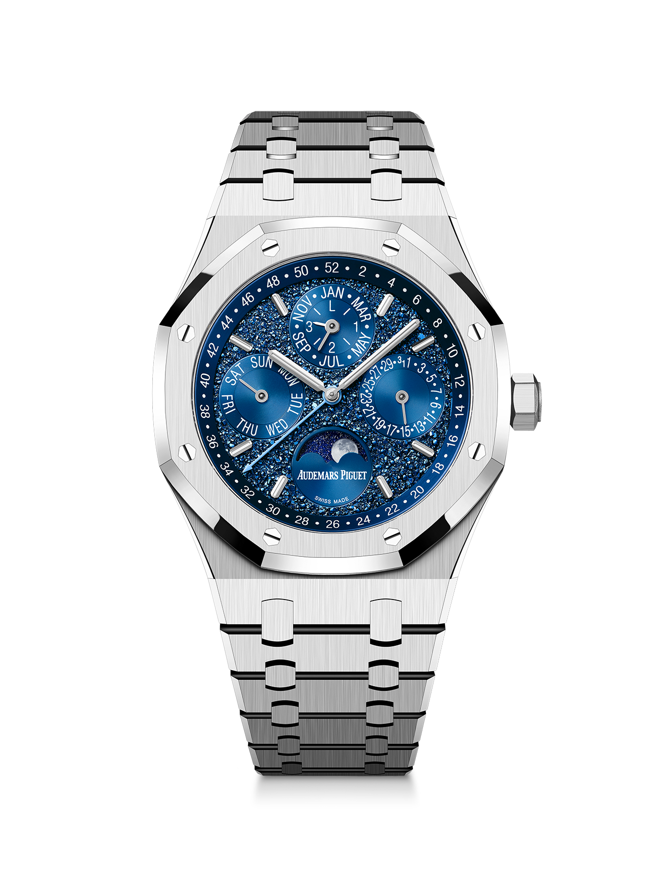Edisi terbatas ini menggunakan motif baru dalam nuansa biru gelap menggunakan teknik Physical Vapour Deposition (PVD), yang mengawetkan dan meningkatkan kedalaman motifnya sekaligus memaksimalkan permainan cahaya. Muka arlojinya dilengkapi subdial warna PVD biru yang serasi, menunjukkan hari pada pukul 9, bulan dan tahun kabisat pada pukul 12, dan tanggal pada pukul 3. Penanda dan jarum jam dari emas putih 18K juga tampak mencolok berlatar biru, semakin terlihat dalam pencahayaan temaram.