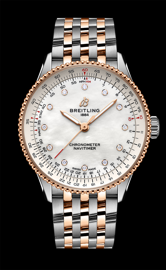 Dengan dial dari mutiara dan bahan berharga, jam tangan ini memancarkan pesona mewah seperti perhiasan. Navitimer B01 Chronograph 43 adalah pilihan lain yang tak kalah mewahnya, selebritas seperti Miles Davis dan Serge Gainsbourg juga merupakan penggemar beratnya. Jam tangan ini menampilkan mistar geser pipih khas dan kembalinya sayap Asosiasi Pemilik dan Pilot Pesawat (AOPA) dari aslinya.
