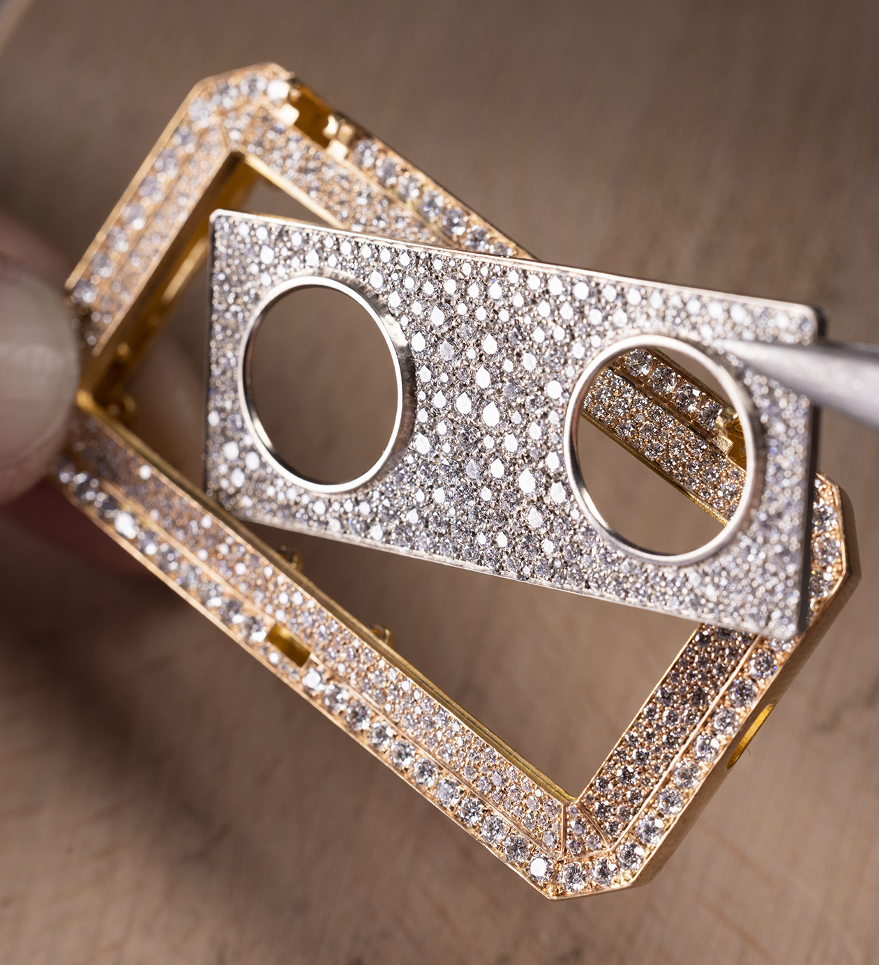 Semua orang tahu karbon dalam industri pembuatan jam, tapi tidak ada yang bermain dengan karbon dan emas secara bersamaan dengan desain dan ketebalan seperti ini. Jadi, setiap waktu merupakan tantangan yang berbeda. Namun tantangan yang paling penting, yang paling sulit dicapai, adalah estetika dan sudut pandang teknis. Misalnya, untuk emas karbon, kami mendesain ulang gelang hingga casing jamnya. Kami mengubah ketebalan kedua komponen ini.