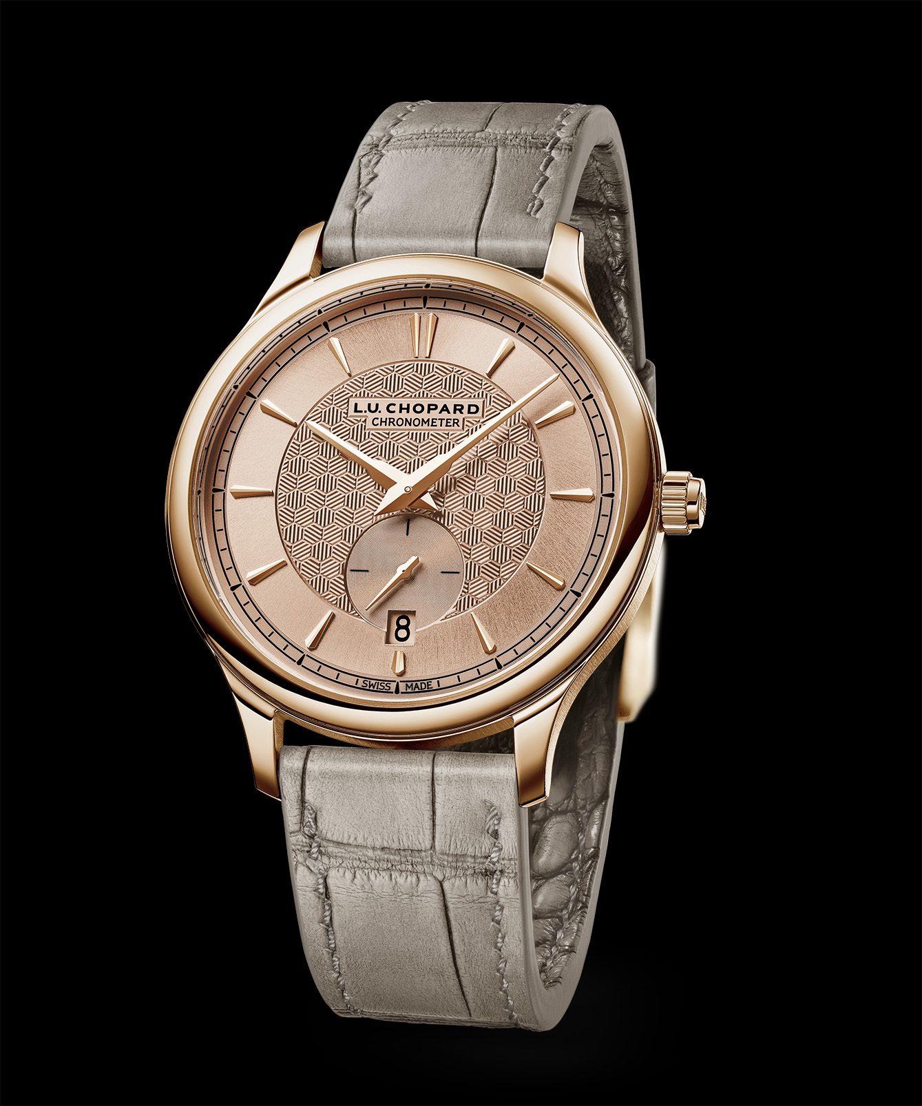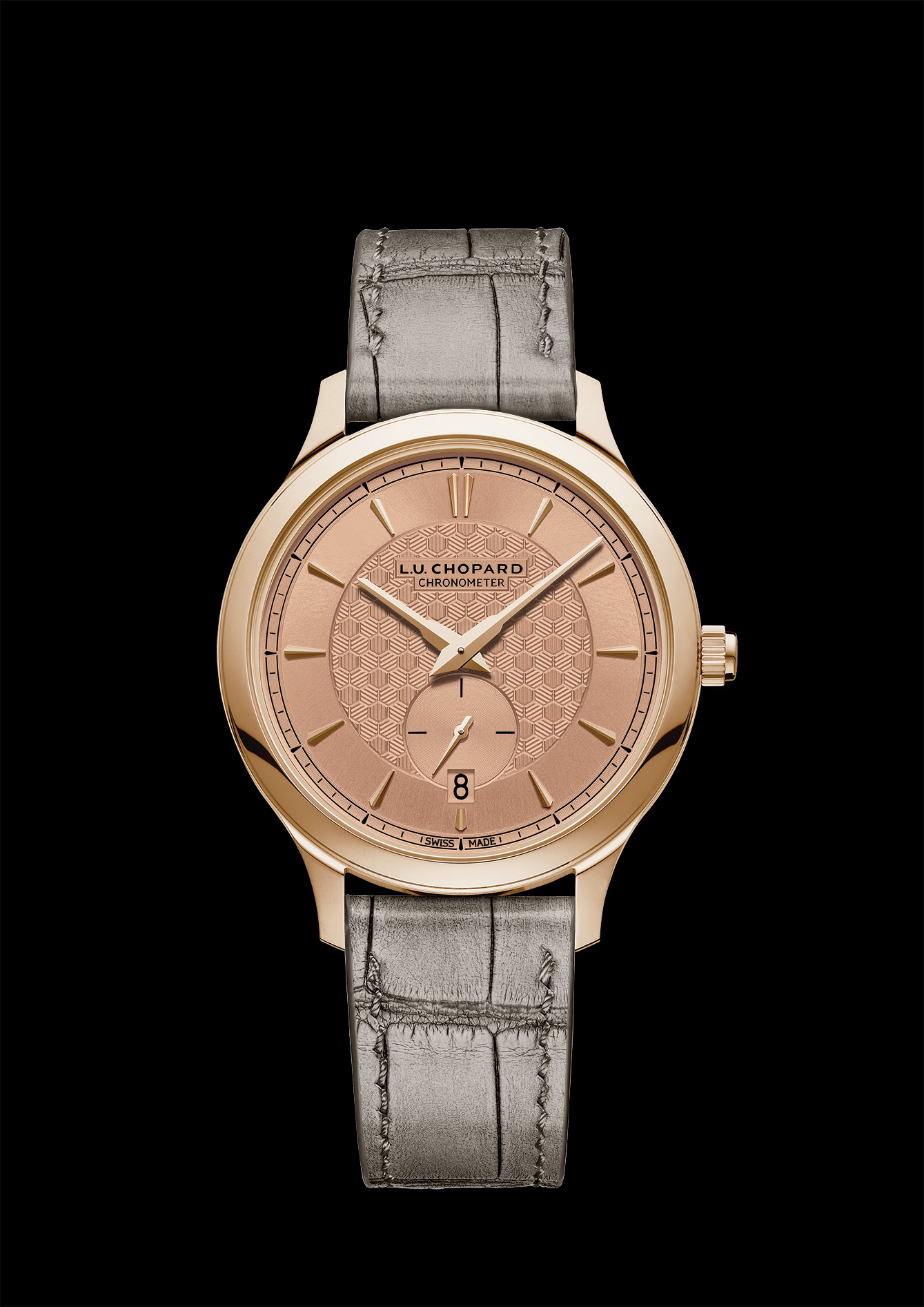 Chopard datang dengan jam tangan berukuran 40mm yang berbahan emas merah muda etis 18 karat. Jam tangan ini menampilkan dial bertekstur guilloche yang menjadi daya tarik utamanya, berkat kedalaman visual dan kilauannya yang elegan. Ada detail klasik bermotif honeycomb di bagian luar caseback yang menjadi nilai warisan dari Chopard. Selain itu, ada hal lain yang membuat jam tangan ini menjadi Istimewa. Bukan dari depan, tetapi dari bagian caseback yang mengadopsi mekanisme katup yang dapat dibuka, dengan ukiran Garuda Pancasila, lambang nasional Indonesia, sebagai gestur penghormatan.