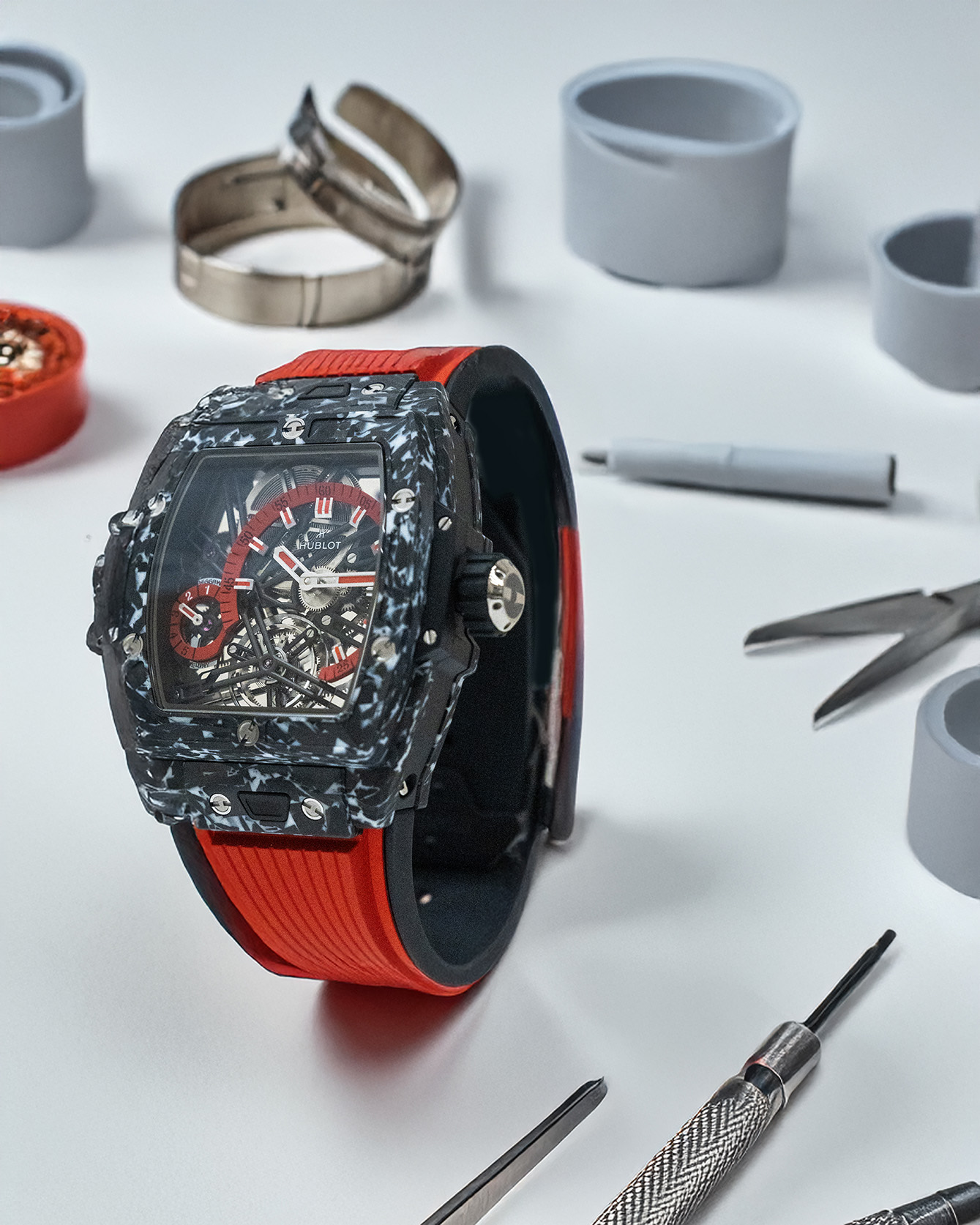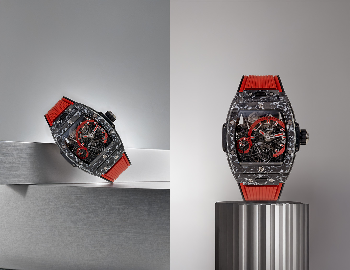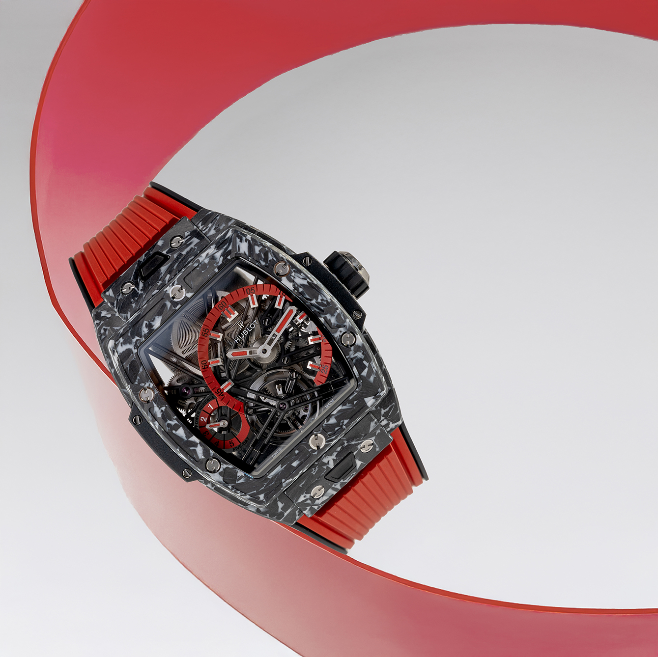 Hublot melestarikan DNA-nya dengan menyatukan inovasi material dan komplikasi tingkat tinggi melalui jam tangan edisi terbatas ini. Pemilihan material case berbahan matte putih dari karbon fros berukuran 42mm, menampilkan pola unik yang menjadikan tampilannya modern sekaligus futuristik. Bagian dial jamnya yang transparan memperlihatkan keindahan konstruksi skelet, dengan penunjuk waktu dan indikator cadangan daya dalam warna merah, memberikan kontras menarik pada estetika serba putihnya. Kemudian mekanisme tourbillon-nya diletakkan pada pukul 6, menjadi pusat utama perhatian yang visibel.