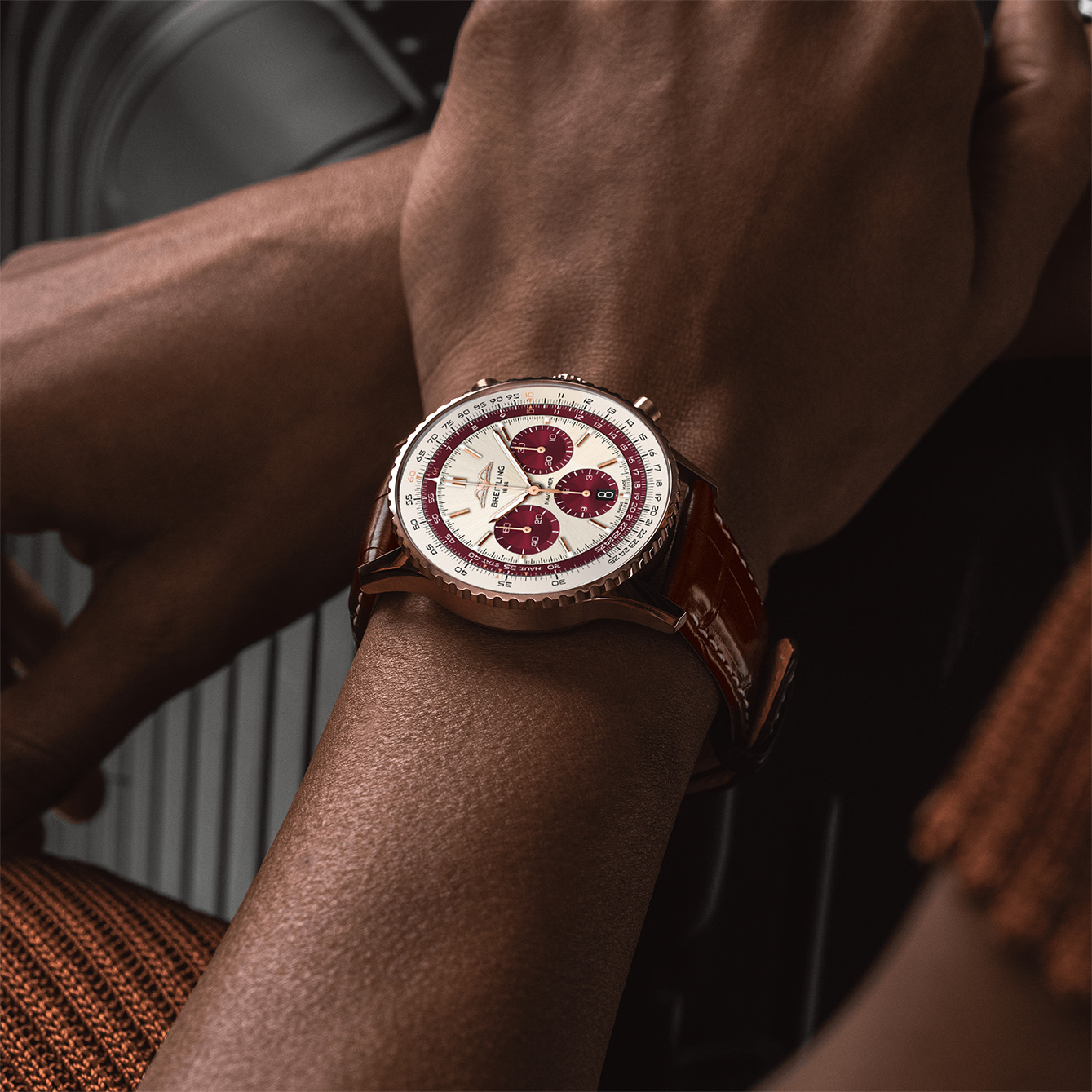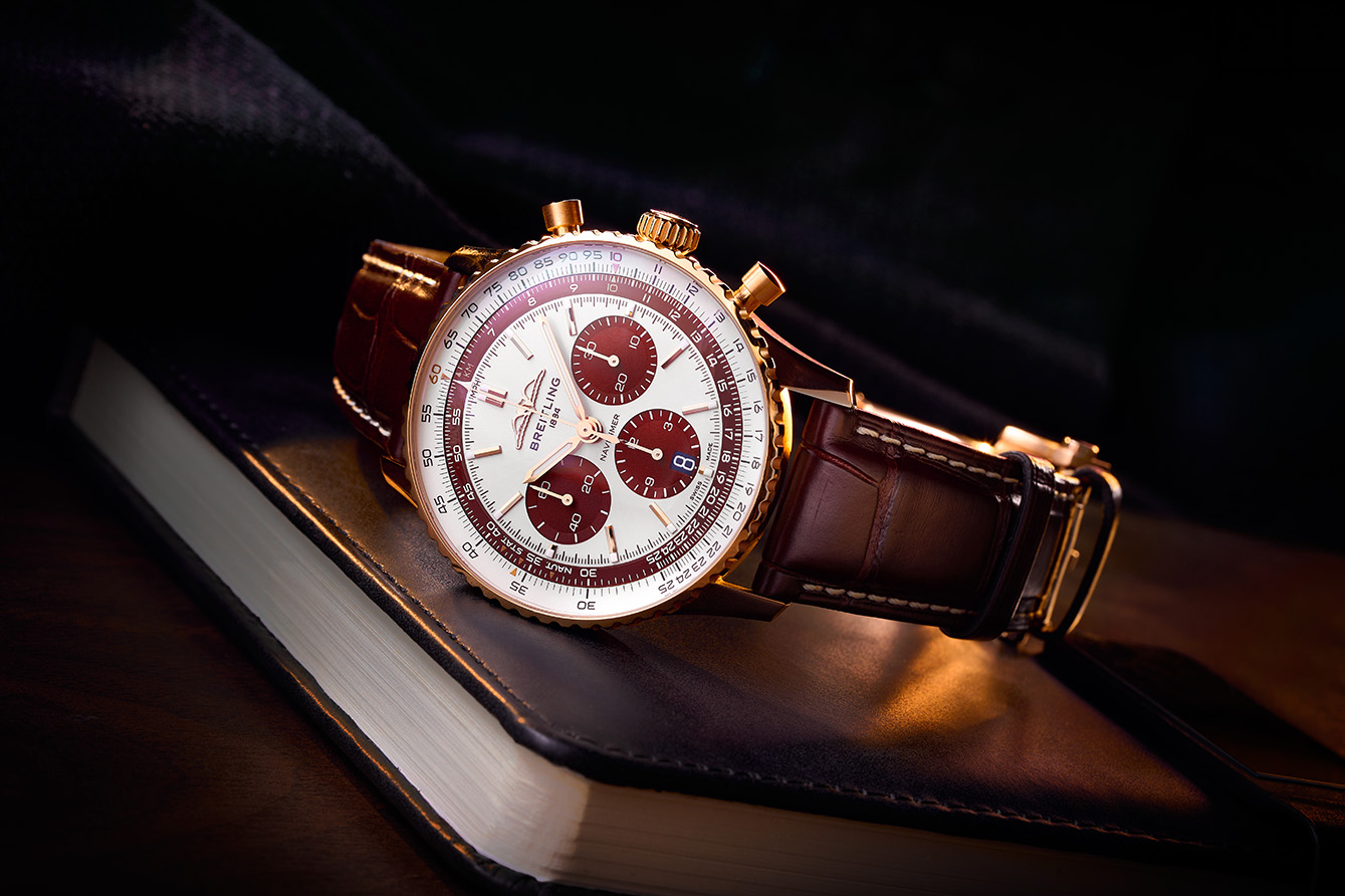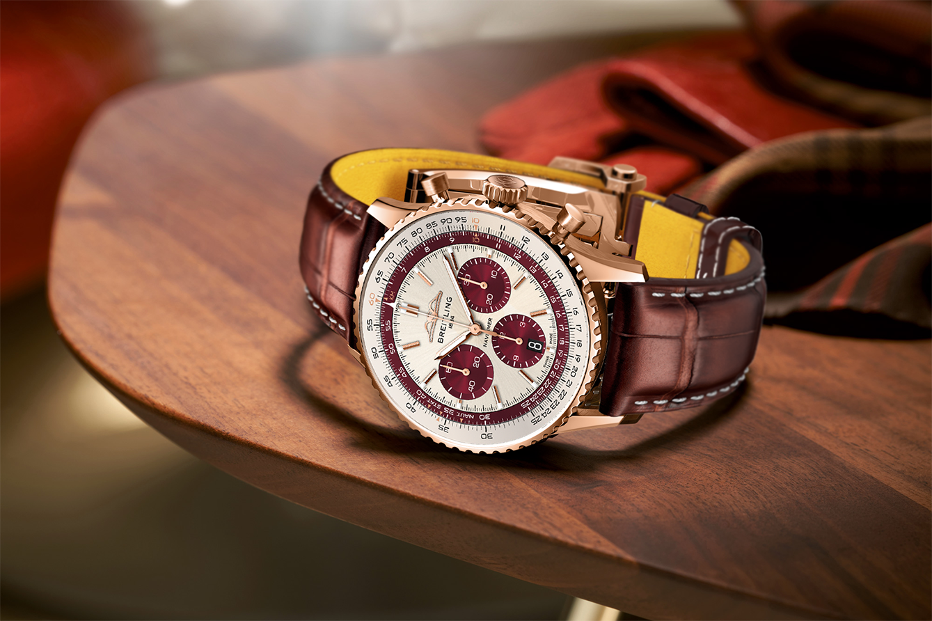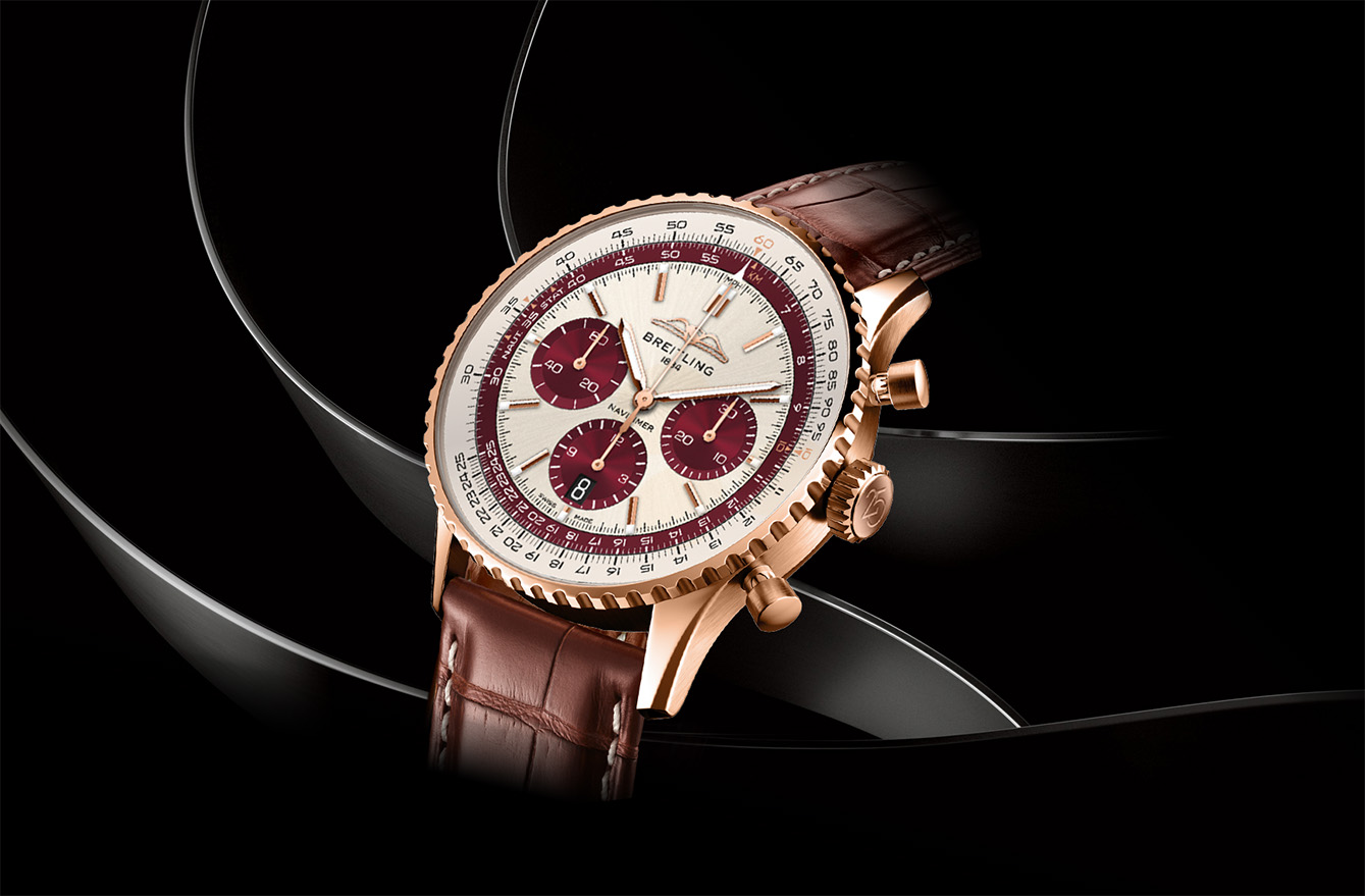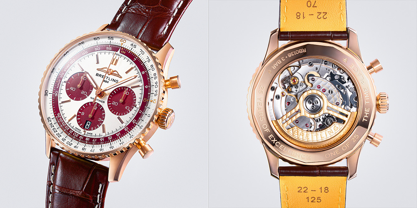 Perwujudan perayaan pertama datang dari Breitling yang mengapsulasi dua peristiwa sekaligus, 25 tahun The Time Place dan 140 tahun Breitling. Bahan emas merah 18 karat dipilih untuk case berukuran 43mm-nya.