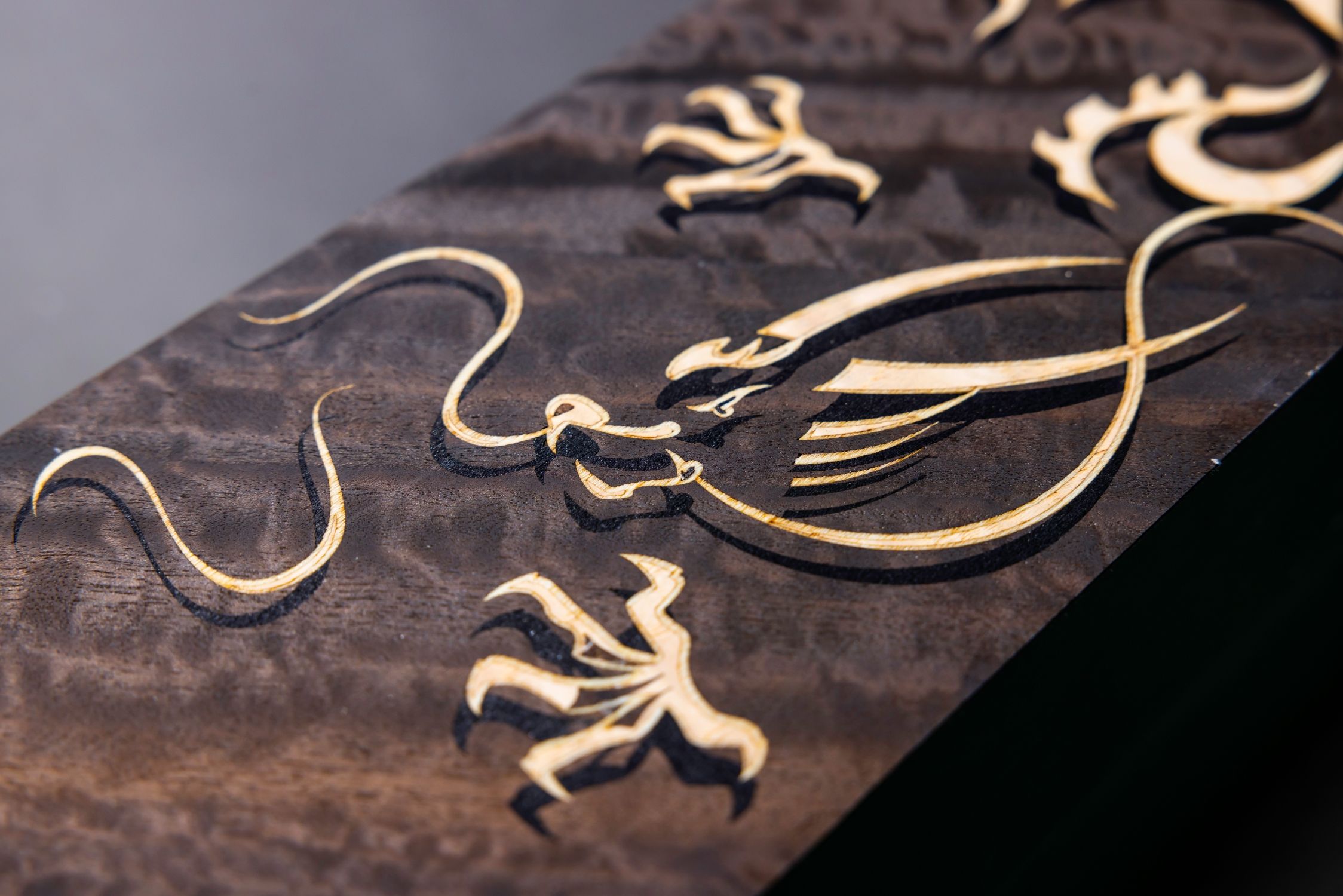 Detil yang luar biasa ini juga memerlukan waktu tiga bulan bagi seorang pengrajin untuk menyelesaikannya. Desain ini menggambarkan dua naga yang dikelilingi oleh awan yang berputar, menjaga mutiara yang diwakili oleh jam khusus. Dasar marquetry ini dibuat dari Smoked Eucalyptus, dengan garis tepi yang terbuat dari veneer Sycamore dan diisi dengan Ash burr, yang dipilih karena seratnya yang mirip dengan tekstur awan. Aksen veneer Bolivar hitam menambah kedalaman, membuat naga tampak mengapung di atas permukaan.