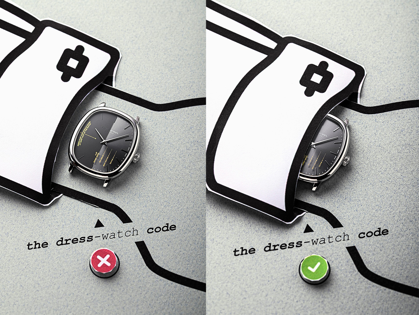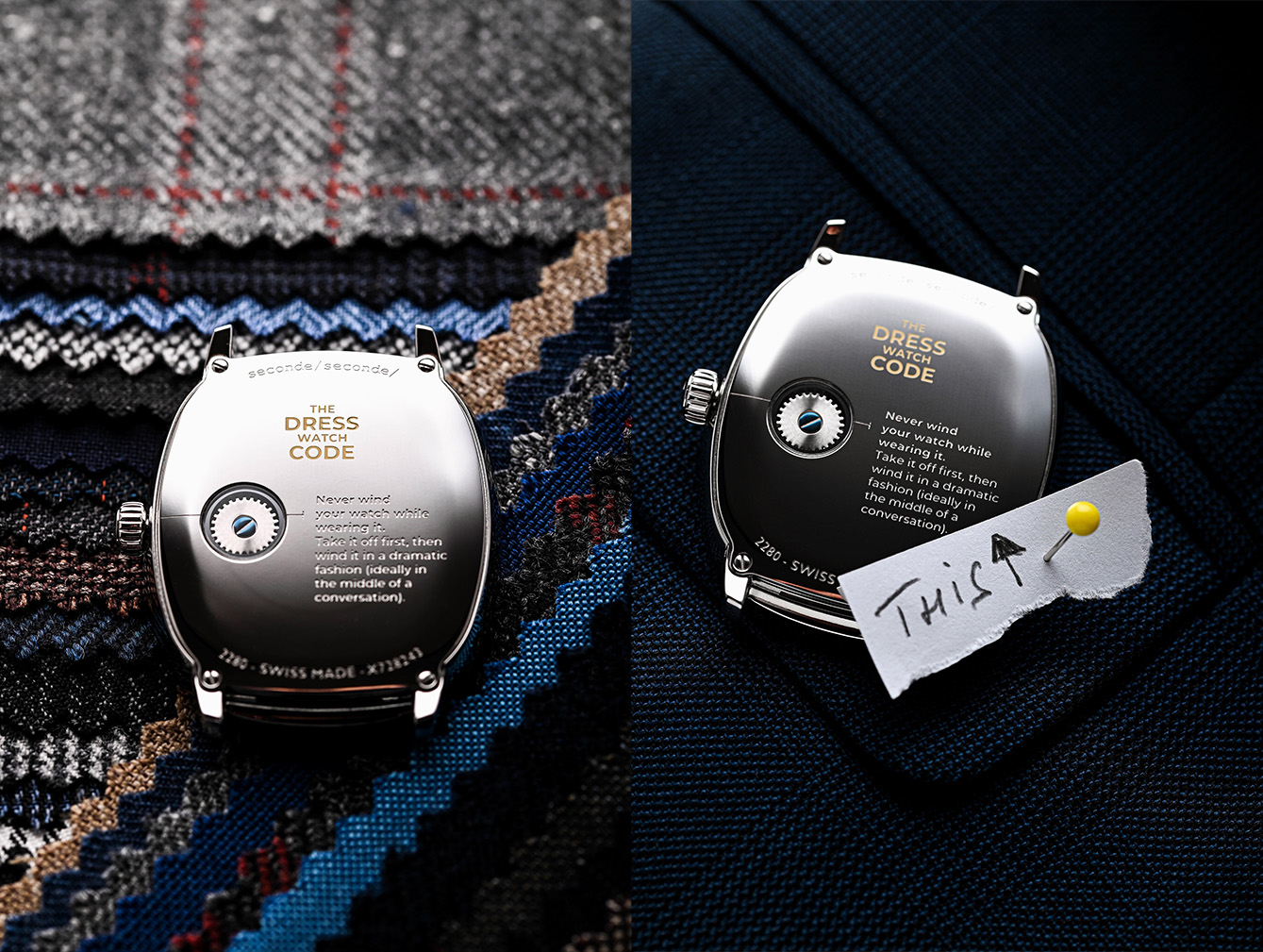 Peran seconde/seconde/ memberi sentuhan baru yang langsung terasa di bagian pelat jam, terutama melalui permainan visual yang membagi area menjadi dua karakter berbeda. Satu sisi tampak lebih tenang, sementara sisi lainnya punya kilau halus yang membuat aturan kecil di atasnya terlihat jelas. Kreasi tersebut melantunkan lafaz tentang bagaimana manset kemeja sebaiknya menutup setengah jam tangan (dalam warna kuning Pantone 7402C), sebuah komentar ringan yang ditampilkan seperti catatan di lembar sketsa pakaian.