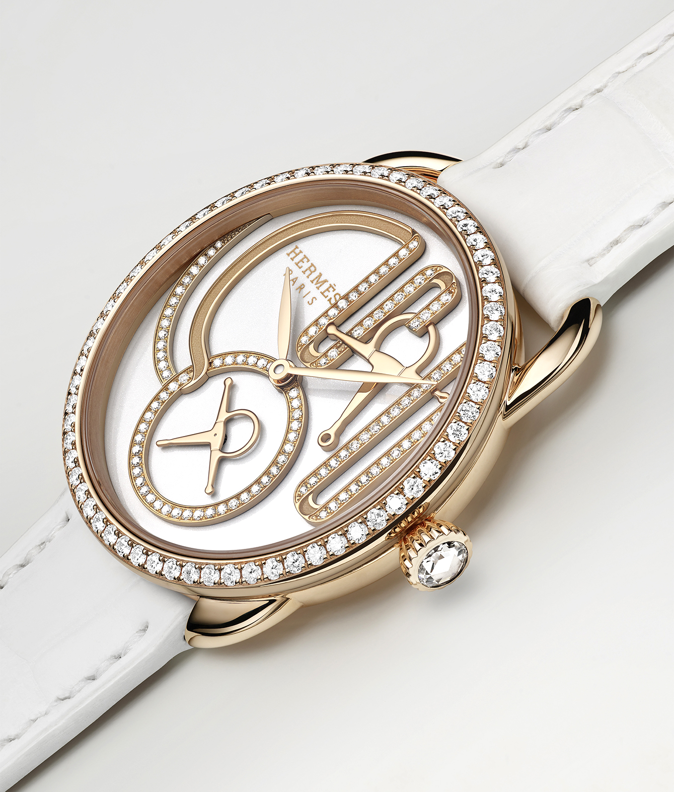 Terdapat dua versi Arceau Grand Tralala, keduanya dalam warna emas merah muda dengan berlian. Pilihannya terletak pada dial jam, yaitu hitam ramping atau putih bersih. Berukuran 34mm, jam cantik ini memamerkan dial jam yang dihiasi sebentuk kekang dan keping saling terkait dalam kecemerlangan emas mawar dan 110 berlian, membentuk dekorasi grafis namun cantik. Dimeriahkan oleh jarum detik kecil berbentuk keping, model ini digerakkan oleh mesin jam Manufacture Hermès H1912 yang terlihat melalui bagian belakang casing berlapis kristal safir. Mesin yang digunakan dirakit dengan perhatian mendetail, mencerminkan tradisi panjang Hermès dalam pembuatan barang-barang mewah.