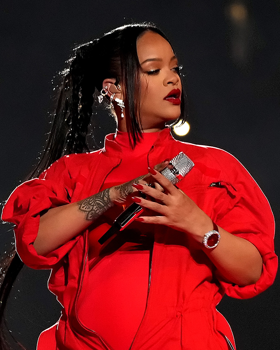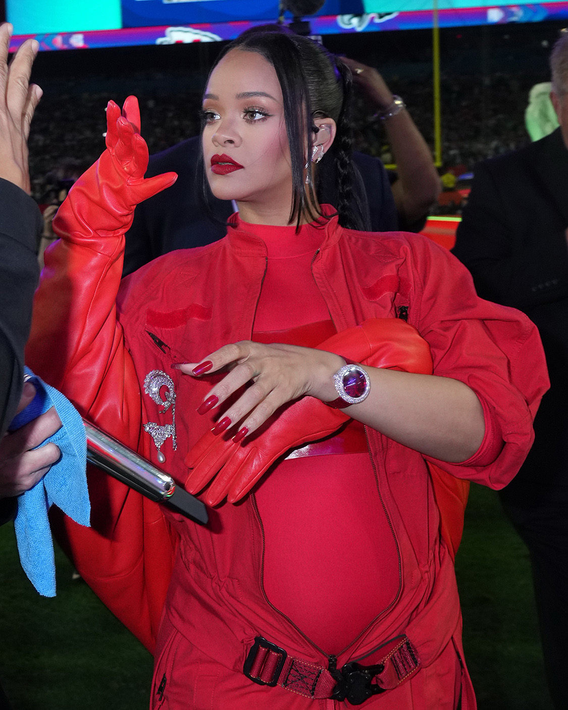Penyanyi, aktris, dan pengusaha terkenal, Rihanna bersinar terang seperti berlian saat mengenakan jam tangan Jacob & Co. Brilliant Northern Lights Red miliknya selama pertunjukan paruh waktu Superbowl.