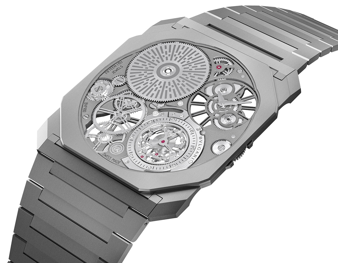 Sementara bezel, bagian tengah casing, dan lug terbuat dari titanium berlapis microbead, pelat utamanya terbuat dari karbida tungsten yang menaungi mesin mekanis, bebeda dengan jam tangan lain yang umumnya terdiri dari casing yang berisi mesin. Selama berabad-abad, tim para pembuat jam di manufaktur Bvlgari mengejar profil yang lebih datar terutama demi keanggunan estetika, dengan mengembangkan perpaduan material canggih.