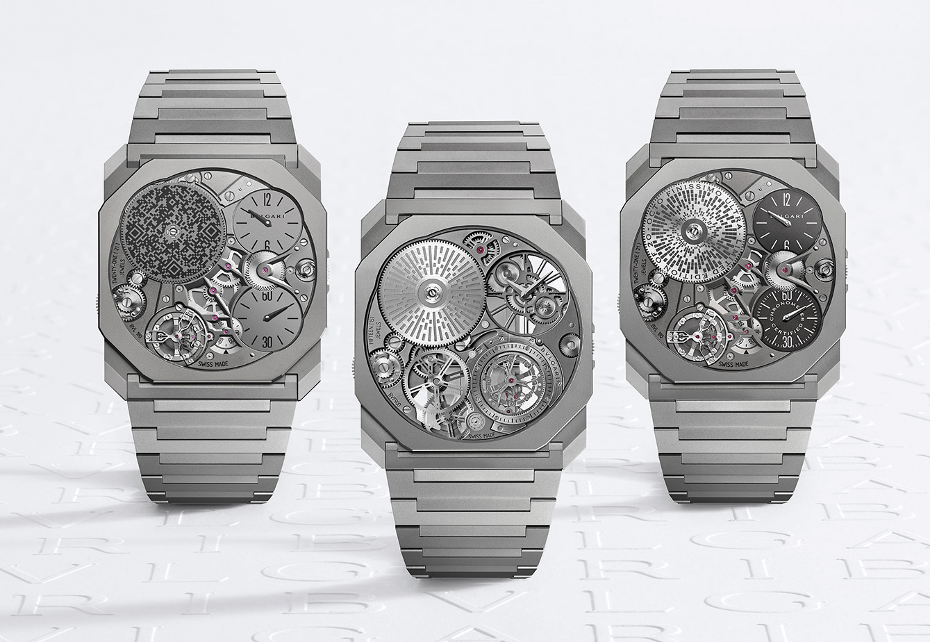 Sementara untuk model Octo Finissimo Ultra Tourbillon terbaru yang dirilis tahun ini, Bvlgari sekali lagi berhasil mendorong batasan pembuatan jam tangan dengan bukti nyata yang terlahir dari presisi dan inovasi. Dengan ketebalan hanya 1,85mm, jam tangan luar biasa ini mencetak rekor dunia baru sebagai flying tourbillon tertipis yang pernah dibuat, dan menandai tonggak sejarah kesepuluh Bvlgari dalam bidang horologi ultra-tipis. Ditenagai oleh mesin jam caliber BVF 900 yang hadir dengan cadangan daya 42 jam dan sentuhan akhir kontemporer yang meningkatkan seni mekanisnya, jam tangan dengan titanium case berukuran 40mm ini dipadukan dengan gelang jam 1,5mm yang sangat tipis, menggambarkan penguasaan Bvlgari terhadap material dan juga desain secara keseluruhan.