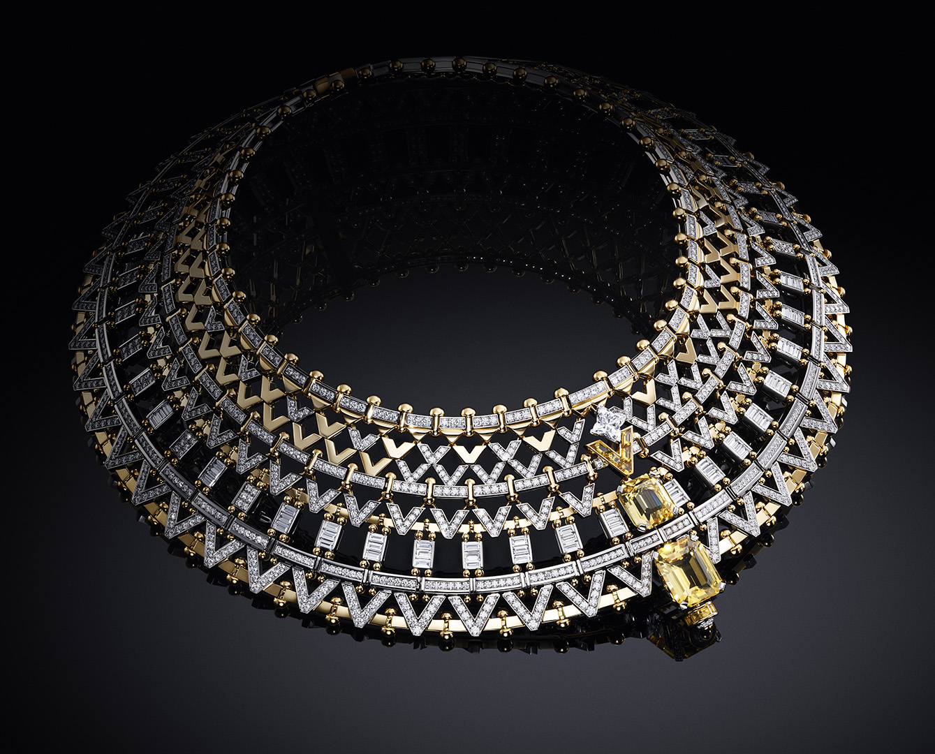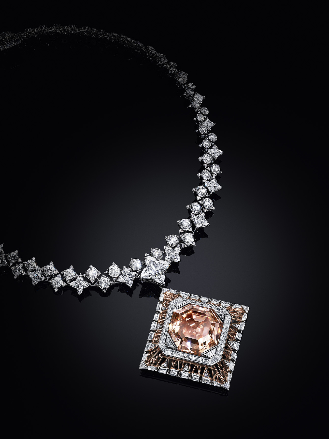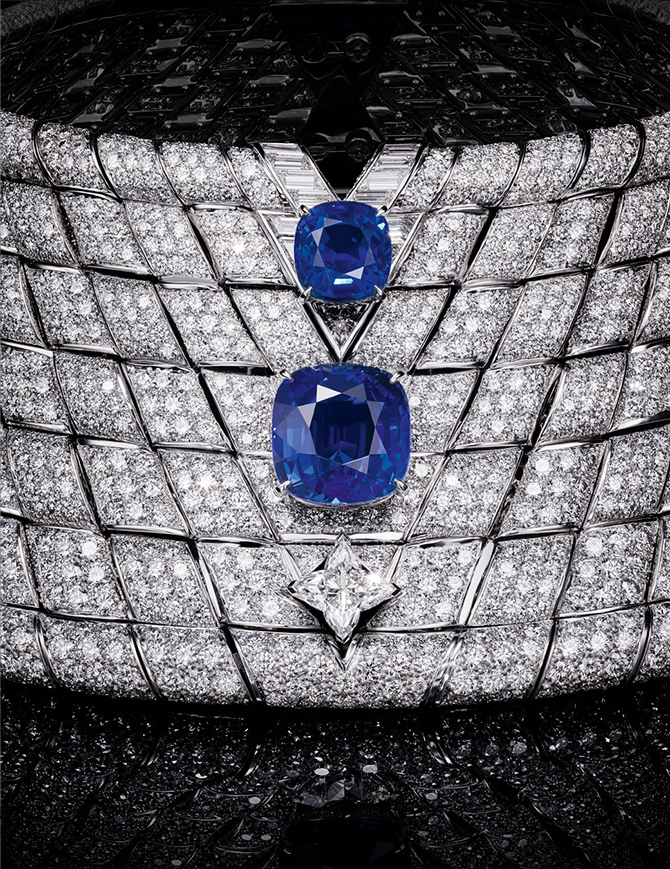 Di puncaknya terdapat berlian 15,16 karat yang dipotong dalam LV Monogram Flower yang terbesar yang pernah ada dalam koleksi perhiasan mewah Maison.