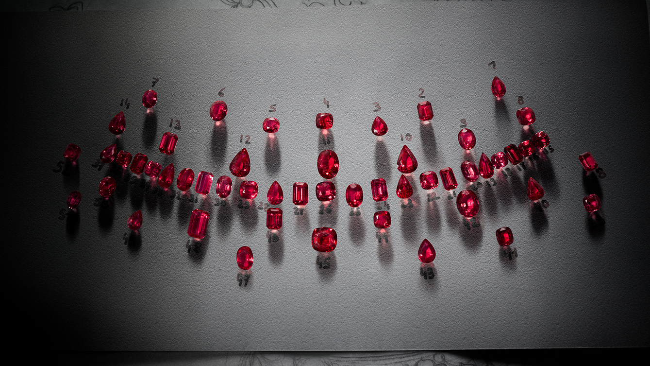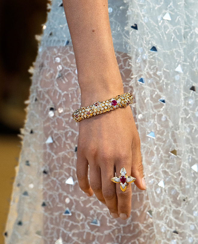 Tema “Splendeur” menjadi pusat perhatian dengan kalung yang memukau, sebagai penghormatan terhadap motif renda, menampilkan Monogram Flower khas Louis Vuitton dengan 52 batu rubi, dengan tenunan emas yang halus mengelilingi bunga, menggemakan pola rumit kain.