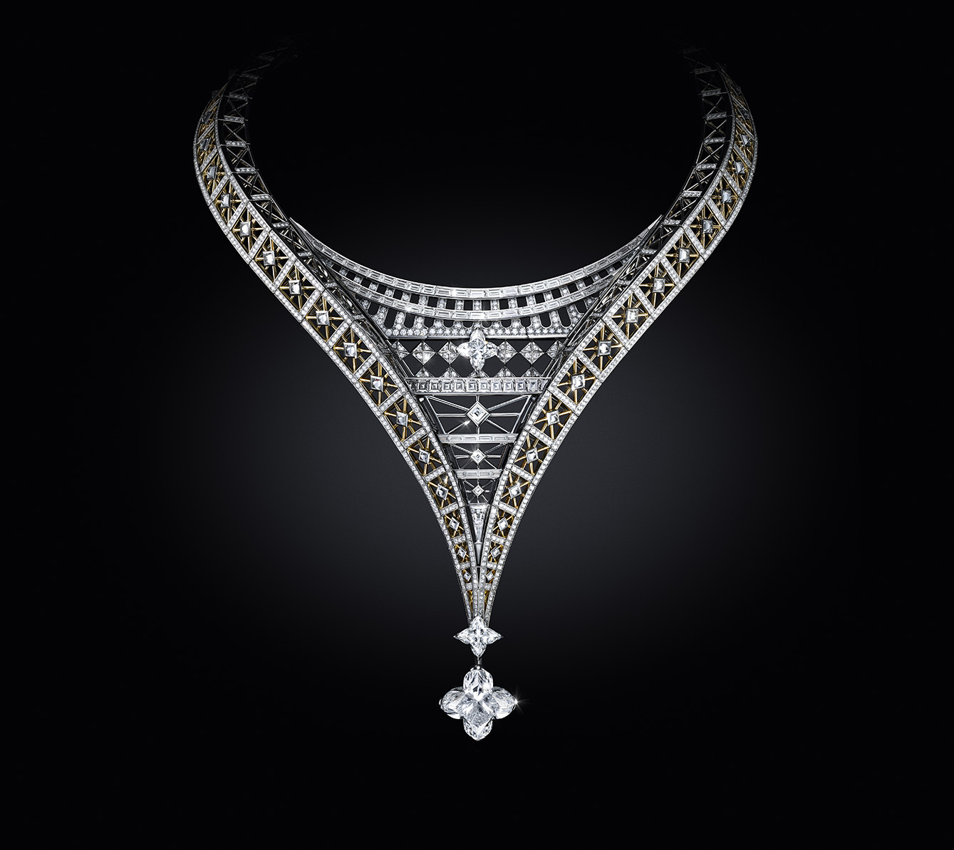 Salah satu kreasi yang terinspirasi oleh periode ini adalah kalung Victoire, yang benar-benar merangkum semangat Prancis dan ikon Paris yang paling dikenal, Menara Eiffel, dengan memamerkan bentuk lengkungan rumitnya secara terbalik dalam penutup berhiaskan permata.