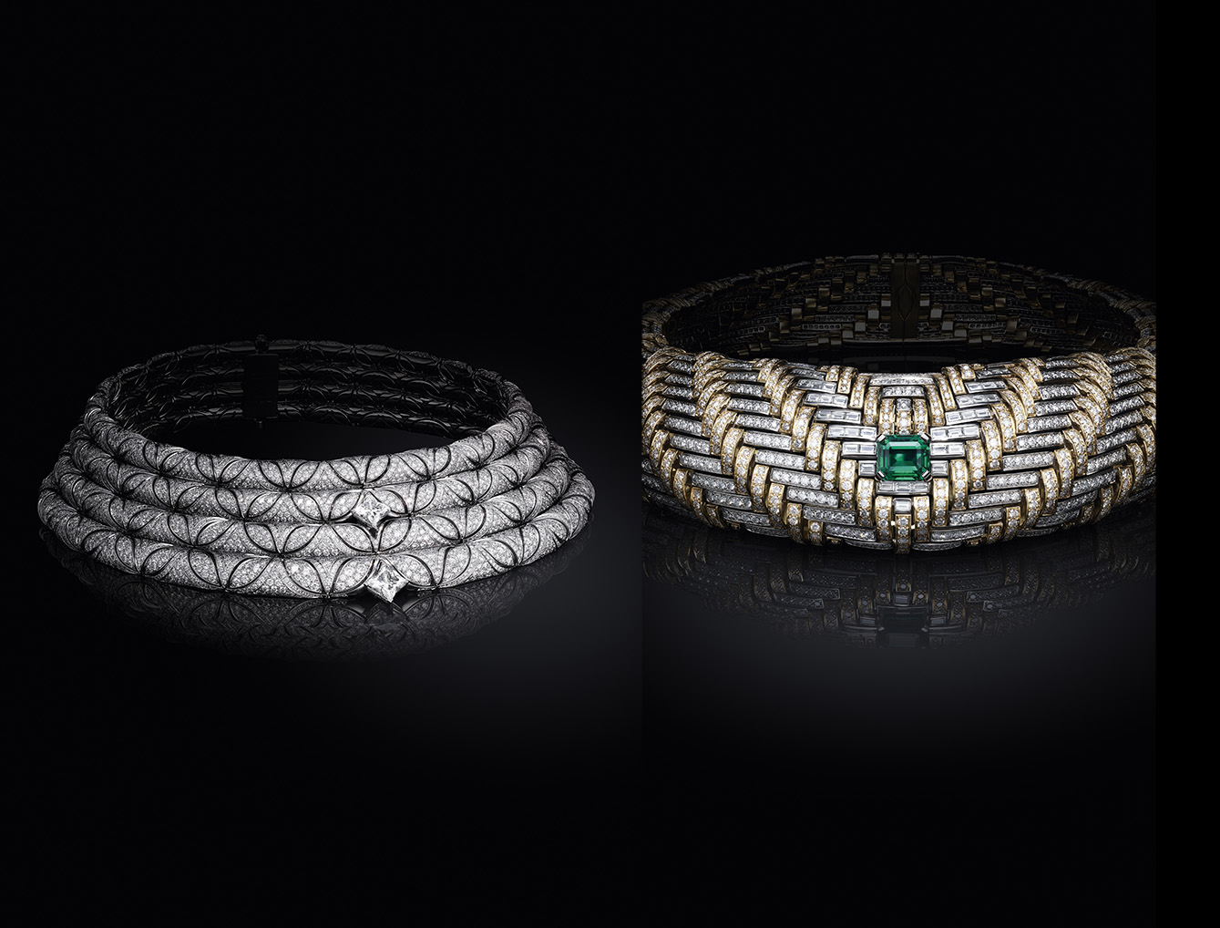 Kalung “Séduction” merayakan keahlian tekstil dan passementerie, brokat mewah, jacquard, dan rumbai yang berkembang pesat di masa itu. Kalung yang lentur ini terbuat dari platinum dan emas kuning dihiasi dengan zamrud Zambia 12,92 karat, dengan ukurannya yang besar dan sedikit warna biru.