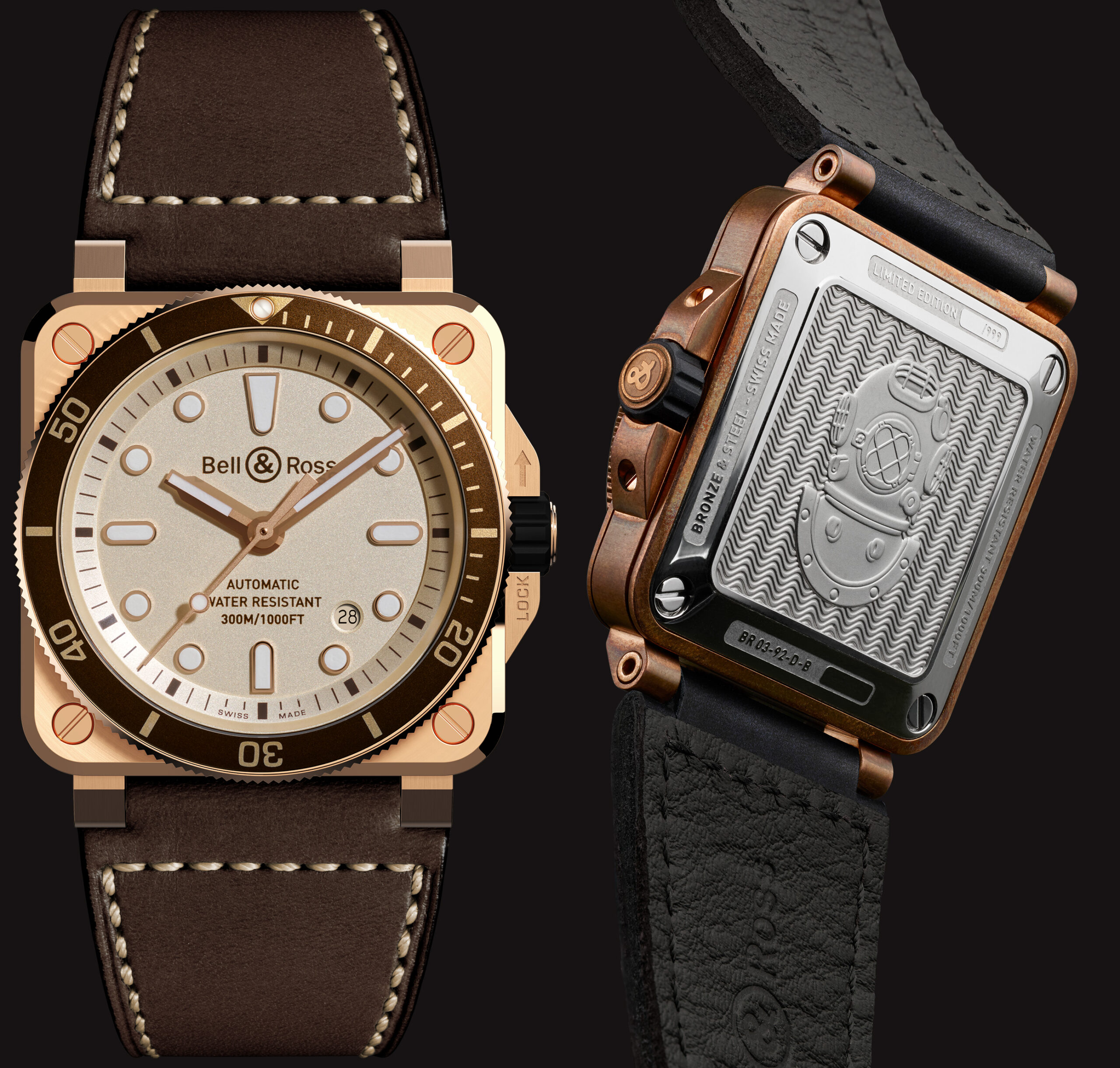 Pada bagian belakang BR 03-92 Diver Bronze juga diperlihatkan helm penyelam yang ikonik, yang sekarang terukir menggunakan hypoallergenic stainless steel. Satu hal yang lebih penting, jam tangan ini juga dibuat sesuai dengan standar internasional ISO-6425, yang menetapkan bahwa sebuah diver’s watch atau “jam tangan penyelam” adalah “jam tangan yang dirancang untuk kedap air pada kedalaman minimal 100 meter dan dilengkapi dengan sistem pengukuran yang aman.”