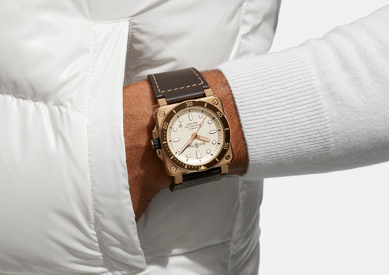 Bell & Ross juga menghadirkan model terbaru lainnya yang tidak kalah menarik melalui BR 03 Diver White Bronze. Secara sekilas ketika dilihat, kombinasi case perunggu dan dial dengan warna putih mutiara mengingatkan akan era paling awal saat penemuan dilakukan di bawah laut, serta ditambahkan sebuah sentuhan kontemporer dengan gaya estetisnya yang mengingatkan pada perlengkapan yacht dan perahu layar yang antik.