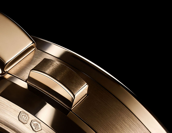 Emas murni, tentu saja, kemudian paladium, tembaga, bahkan silisium untuk menjadikannya keras. Ini bukan hanya soal campurannya, tetapi juga treatment-nya. Jika Anda melihat jam tangan ini, folding buckle jamnya terdiri dari dua bahan, bagian ini Honeygold dan bagian lainnya emas putih. Dan ada alasan teknis mengapa menggunakan bahan berbeda, karena ada bahan lebih mudah untuk dibentuk.
