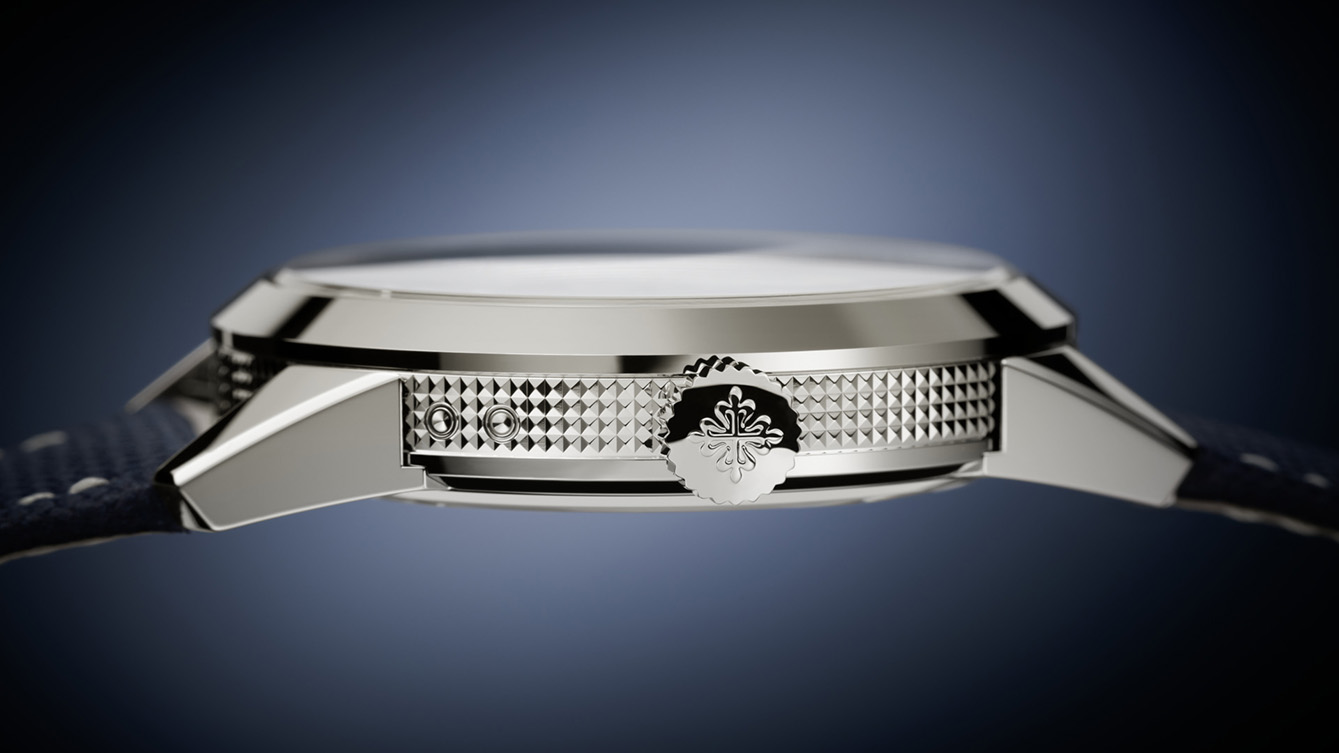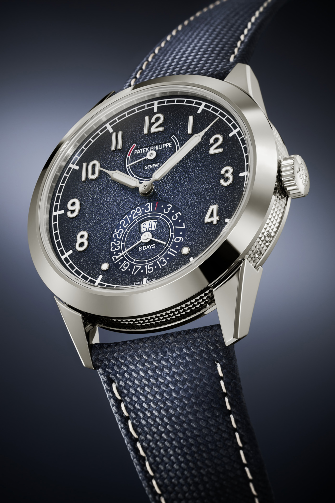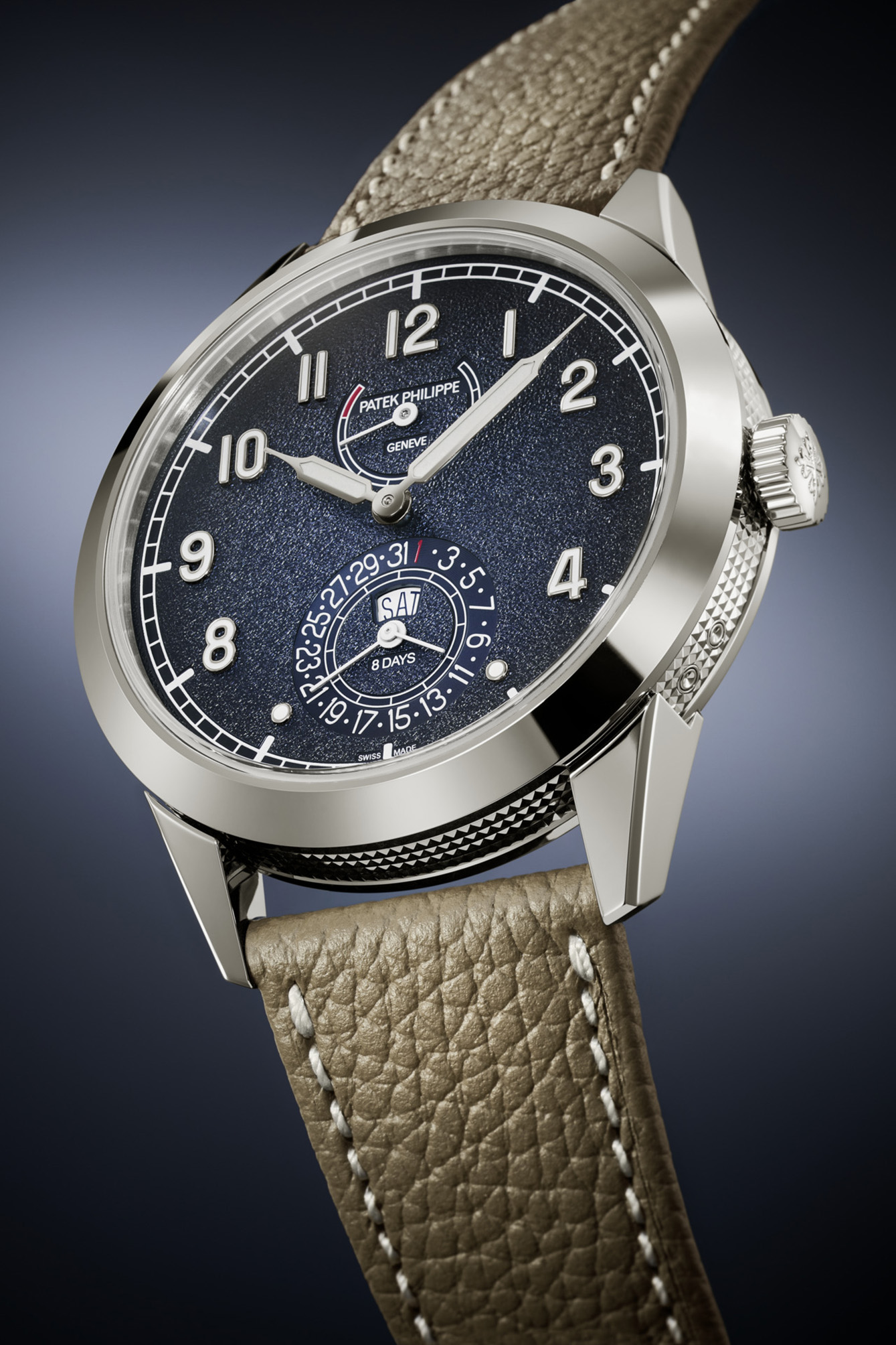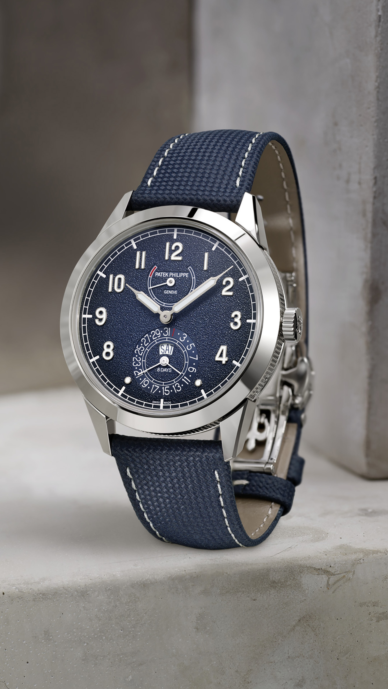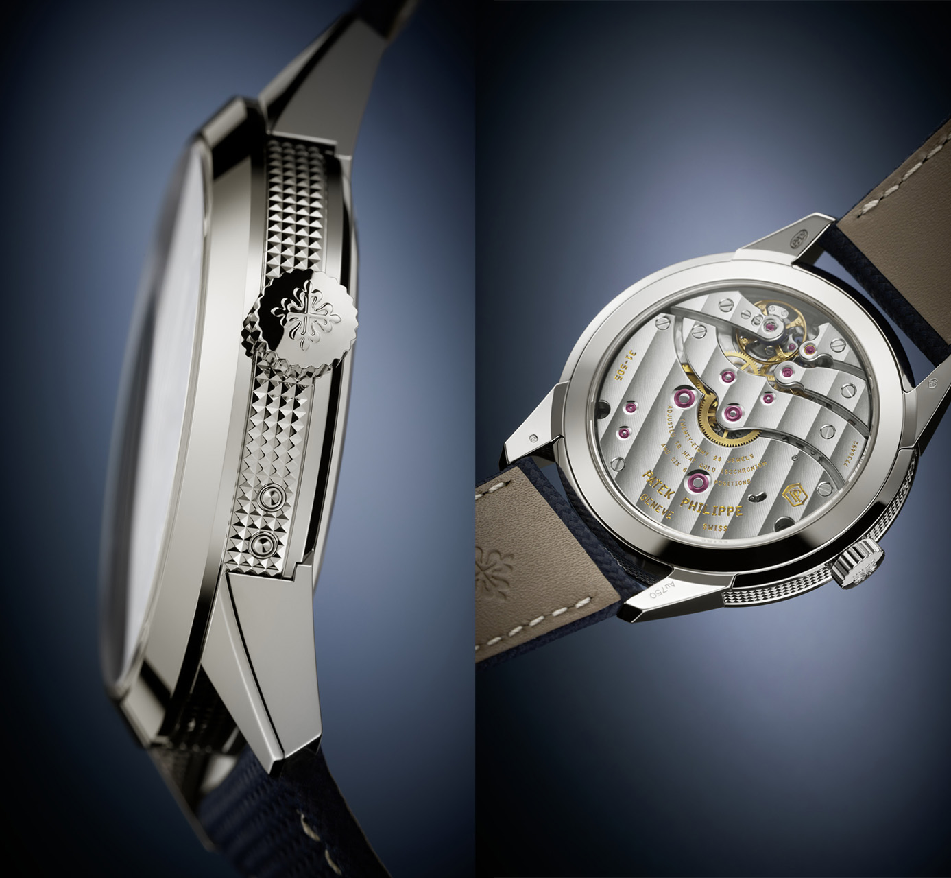Setiap sisi Ref. 5328G-001 memancarkan paras memesona yang lahir dari perpaduan tradisi dan sentuhan kontemporer. Case emas putih berdiameter 41 mm dihiasi teknik Clous de Paris guilloché di seluruh caseband, sebuah detail ikonis yang mengingatkan pada warisan Calatrava klasik. Dial biru dengan gradasi hitam di tepi tampil bersih namun berkarakter, mempertegas jarum syringe dan indeks emas putih yang dilapisi luminesen untuk memastikan keterbacaan optimal. Tata letak vertikal menghadirkan keseimbangan visual, dengan indikator cadangan daya di atas, serta sub–dial detik kecil dan tampilan hari-tanggal di posisi enam. Selain menawarkan kekuatan mekanis dan desain memikat, Ref. 5328G-001 dirancang untuk memberikan kenyamanan yang nyata dalam setiap pemakaian.