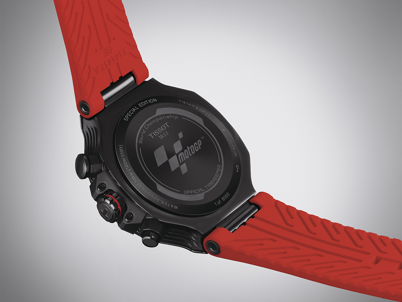 Terdapat cakram rem dan kaliper pada bezel, dengan tombol pusher terinspirasi dari setang, dan sirip pendingin mesin terukir di sisi casing. T-Race MotoGP™ Limited Edition ini kedap air hingga kedalaman 100 meter, mengusung casing berdiameter 45mm yang terbuat dari baja tahan karat berlapis PVD hitam, dan mesin jam chronograph Quartz, serta jarum jam dan menit yang dilapisi dengan Super-LumiNova®.
