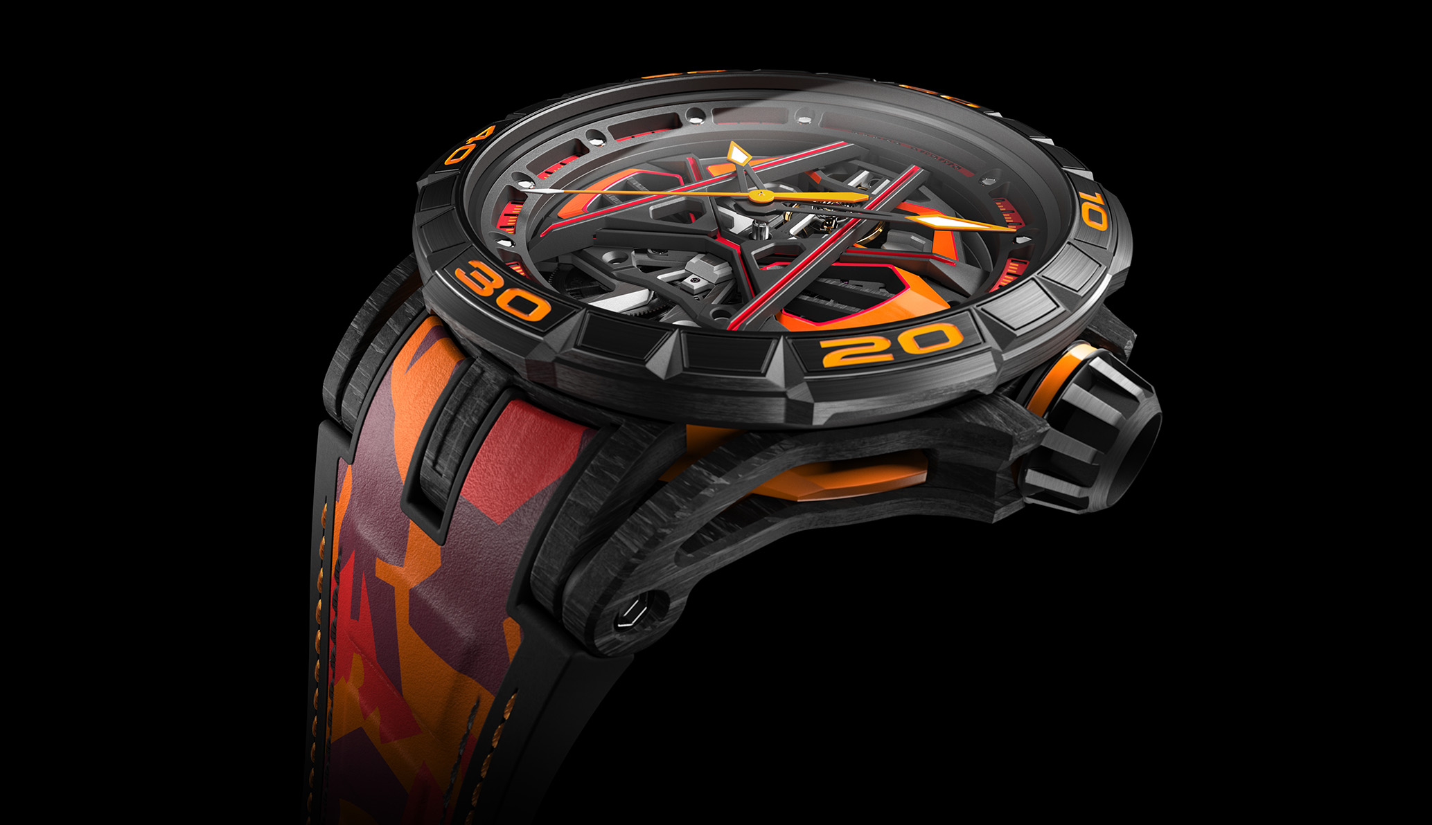 Penanda menit yang diperbesar pada bezel terinspirasi oleh pelindung spatbor khas Sterrato, yang terbuat dari titanium berlapis DLC hitam, dan sedikit dinaikkan untuk mencerminkan ground clearance supercar yang lebih tinggi. Garis merah pada dial jam dari pukul 12 hingga 7, dan dari pukul 12 hingga pukul 5 mengingatkan pada garis-garis rak atap Sterrato, sementara tali jam berpola kamuflase, mengingatkan kita pada kemampuan supercar mengemudi di jalan beraspal.
