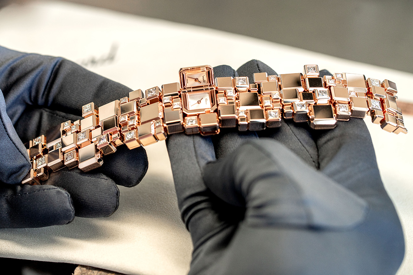 Permukaan perhiasan ini, yang dipoles hingga menghasilkan finishing bagaikan cermin, juga melewati proses hingga beberapa tahap. Masing-masing dipoles secara cermat dengan kain lembut dan kering (hand-buffed) hingga mencapai kilau khasnya, sementara bagian yang dihiasi berlian juga dipasang secara cermat dengan tangan. Peleburan teknologi canggih dan keahlian artisan ini mengangkat prestise koleksi Ice Cube, menjadikannya bukti nyata akan dedikasi Chopard terhadap kesempurnaan.