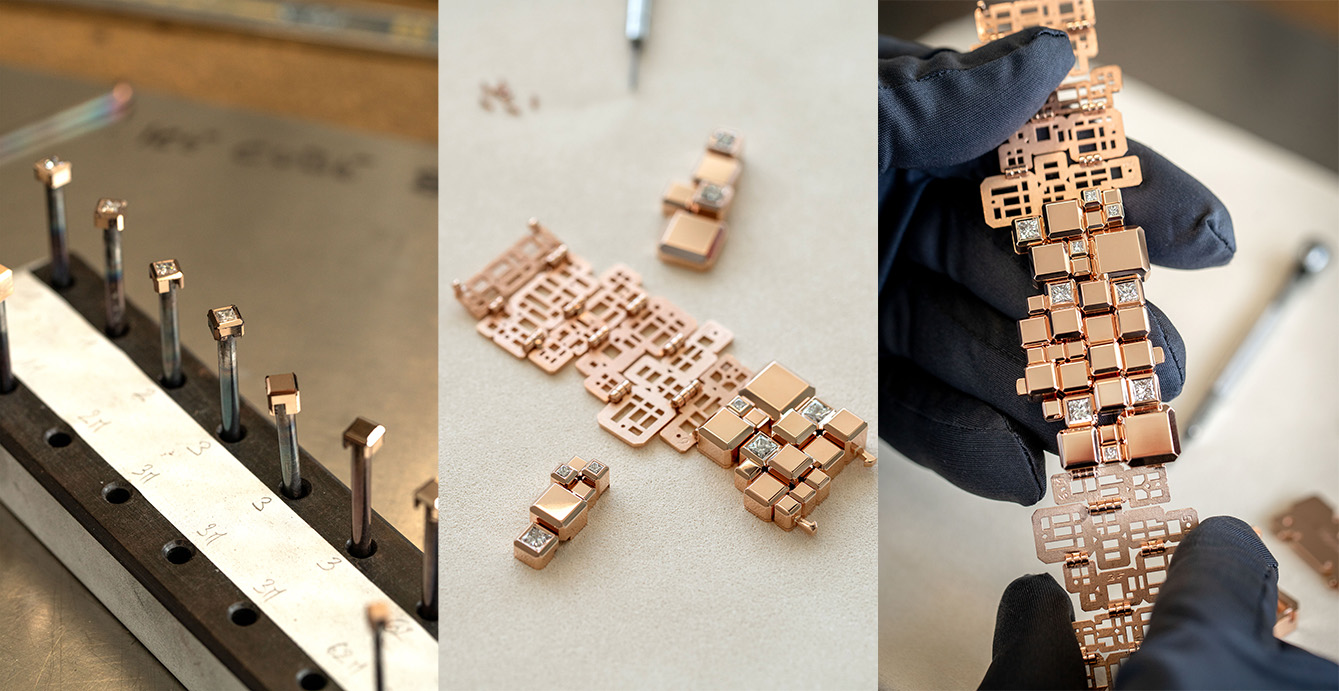 Setiap kubus dalam koleksi Ice Cube memiliki sudut-sudut bersisi halus yang memperkuat bias cahayanya, menciptakan kecemerlangan yang tiada tandingnya. Untuk mencapai efek optikal seperti ini membutuhkan penelitian dan pengembangan mendetail selama enam tahun, menghasilkan teknik permesinan canggih yang memastikan presisi tanpa cacat.