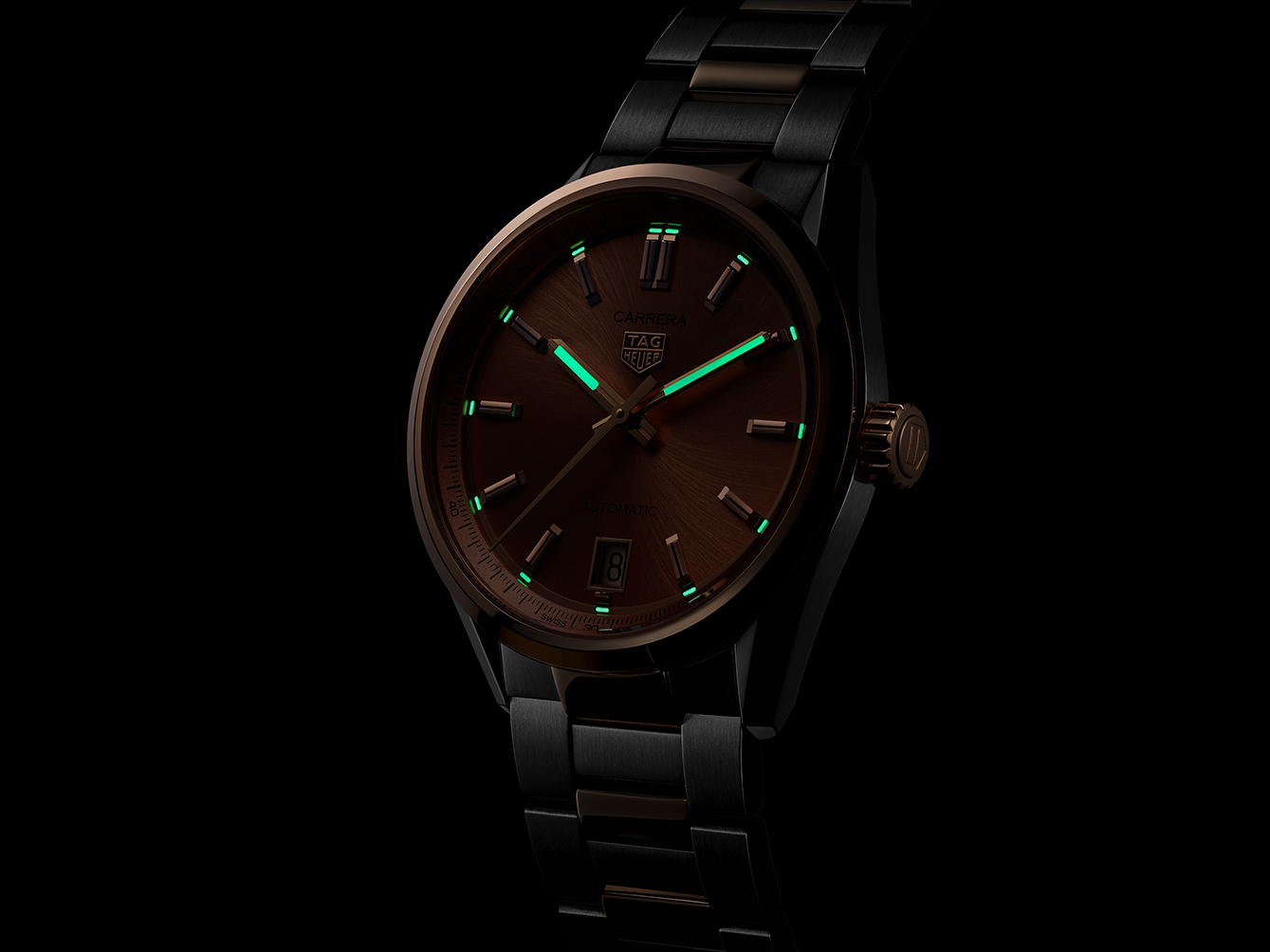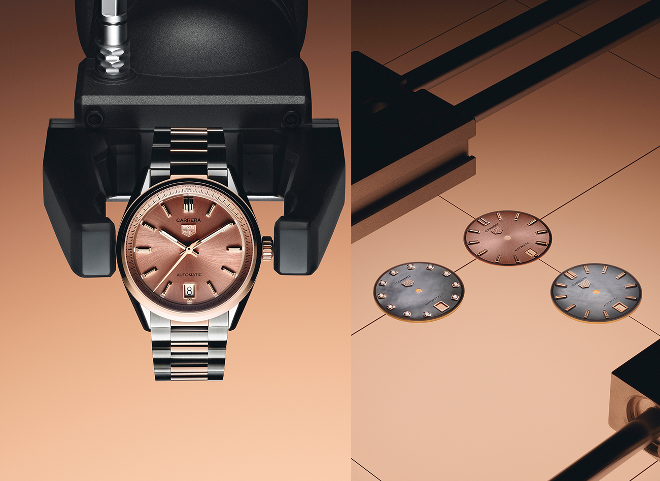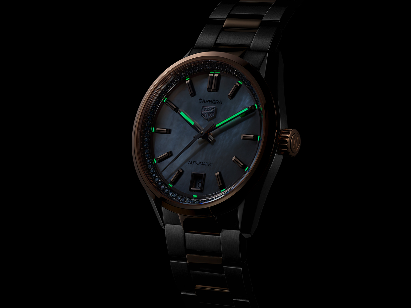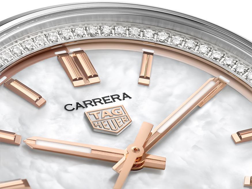 Model terbaru TAG Heuer Carrera Date membawa aspek kemewahan ke tingkat yang lebih tinggi. Model ini dibuat dengan jeli, dalam tiga varian, pertama dial dengan bahan mother of pearl, stainless-steel, dan bezel diamond. Kedua, dial berwarna copper, stainless-steel, dan emas merah muda.