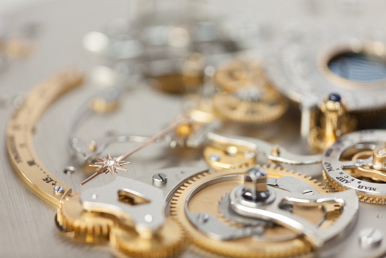 Untuk membuat fungsi ini lebih nyaman, indikator yang dioperasikan oleh kenop diatur secara cerdas pada dial jam, dan rangkaian rodanya, dengan dua tuas baja, dipasang tepat di bawah dial di bagian bawah mesin jam.