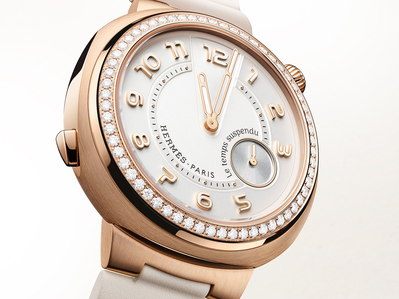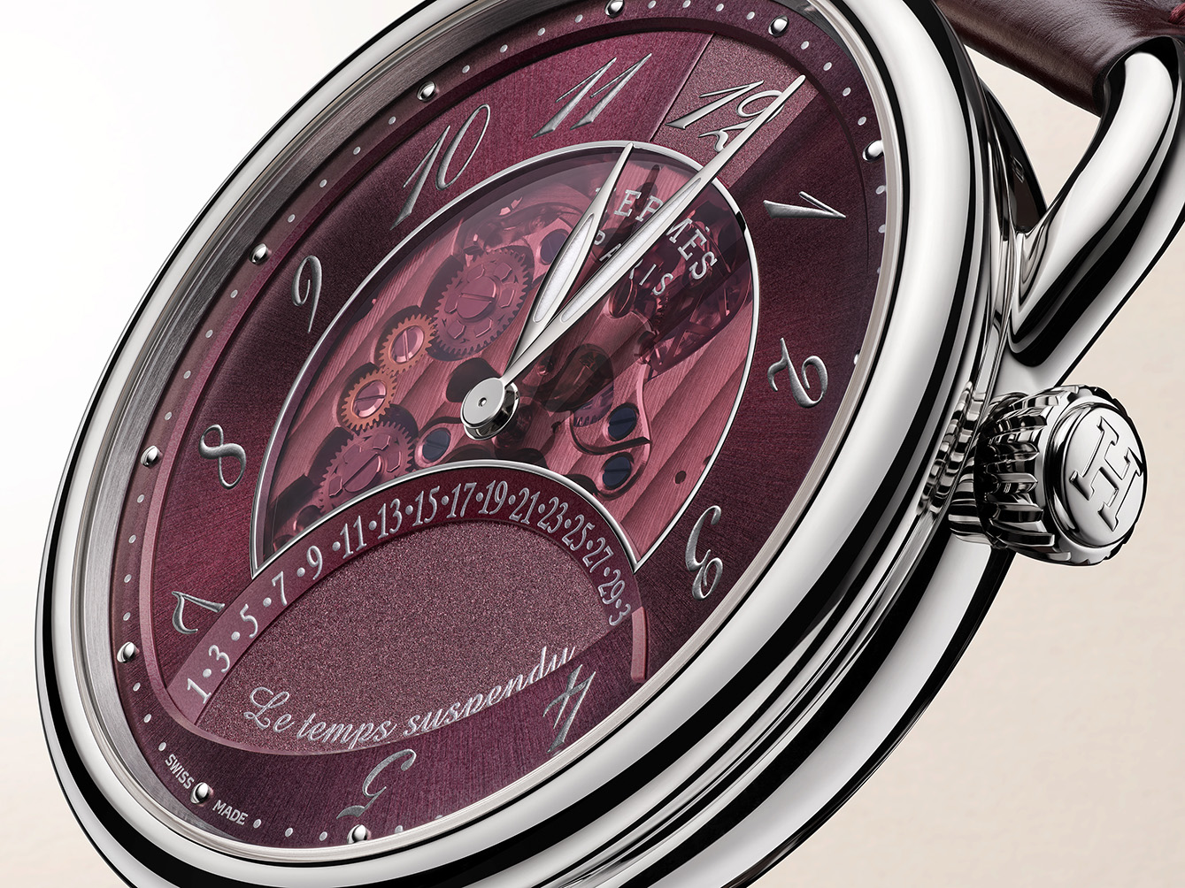 Untuk pertama kalinya, komplikasi time suspended hadir dalam bentuk geometris khas Hermès Cut. Case 39 mm-nya membentuk lingkaran yang nyaris bulat penuh, namun dipahat oleh garis-garis tajam yang memunculkan karakter.