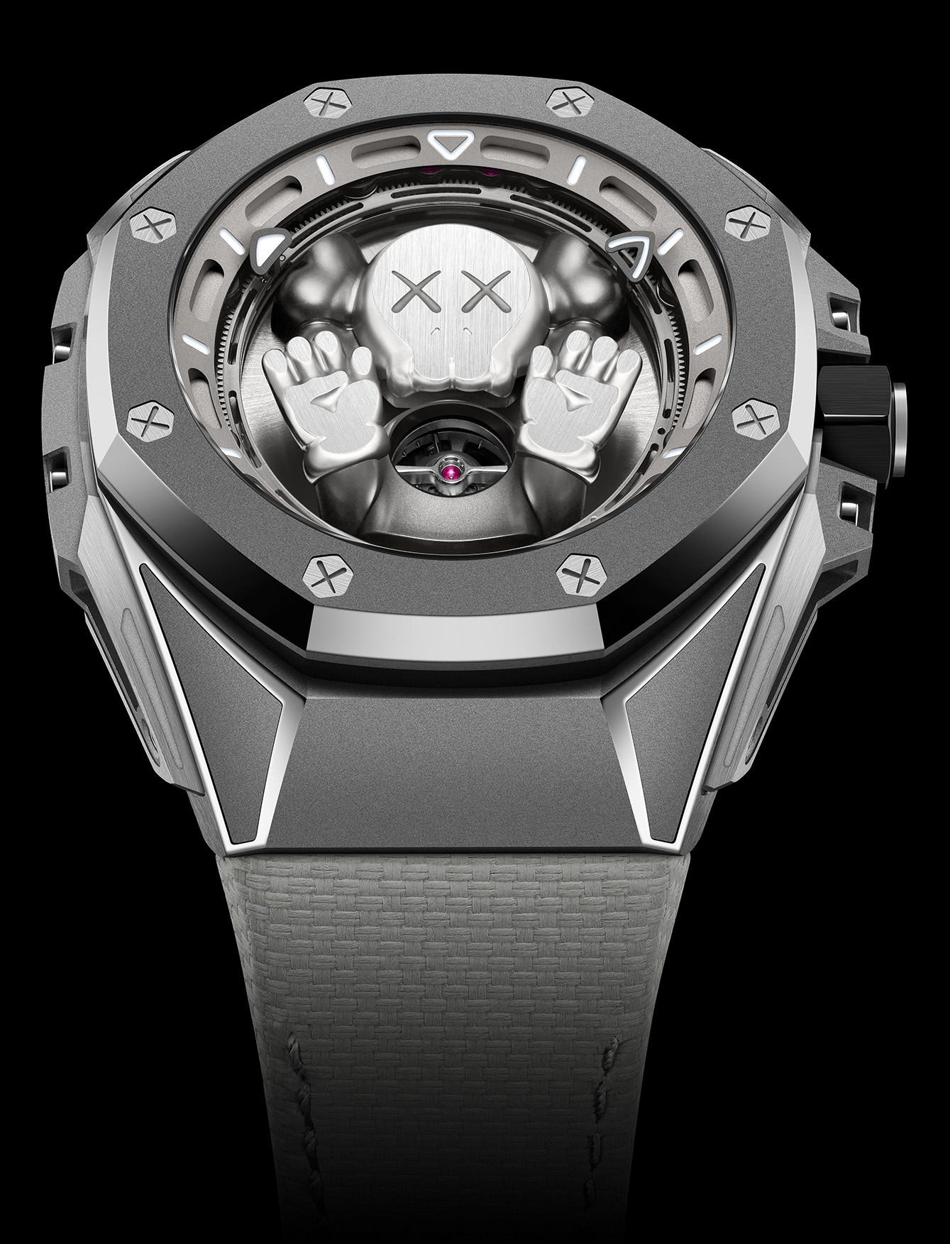 Material yang digunakan mencerminkan nilai seni Kaws sekaligus keahlian Audemars Piguet. Titanium menjadi kanvas utama, dari dial hingga case multifaset. Tekstur berlapis hasil sandblasting dan satin–brushing memunculkan permainan cahaya yang dinamis, selaras dengan estetika futuristik Royal Oak Concept.