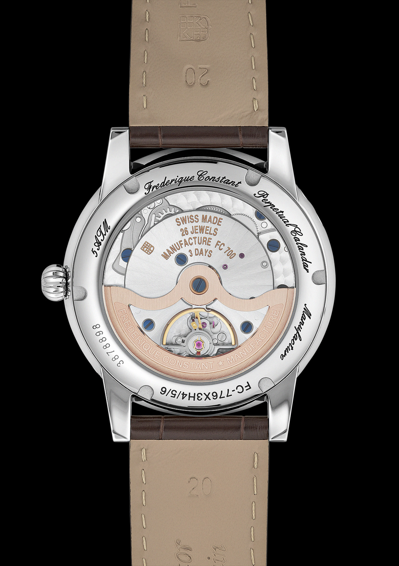 Khusus tentang mesin jamnya, koleksi kalender abadi yang canggih ini ditenagai oleh kaliber Manufacture FC-776 terbaru yaitu kaliber ke-34 yang dikembangkan secara internal oleh merek ini, yang menawarkan cadangan daya tiga hari setelah pengembangan kaliber 706-716 pada tahun 2024. Terlihat melalui penutup belakang safir, mesin berpresisi tinggi ini berdetak pada frekuensi 4 Hz. Setiap jam tangan disesuaikan dan diuji dalam enam posisi, dan memastikan keakuratannya tetap tinggi saat dikenakan dalam situasi sehari-hari. Kaliber Manufacture FC-776 menggunakan sebagian besar komponen yang sama dengan basis teknis yang sudah ada dalam koleksi Manufacture, FC-775, menjadikannya mesin yang sangat andal dan telah teruji.