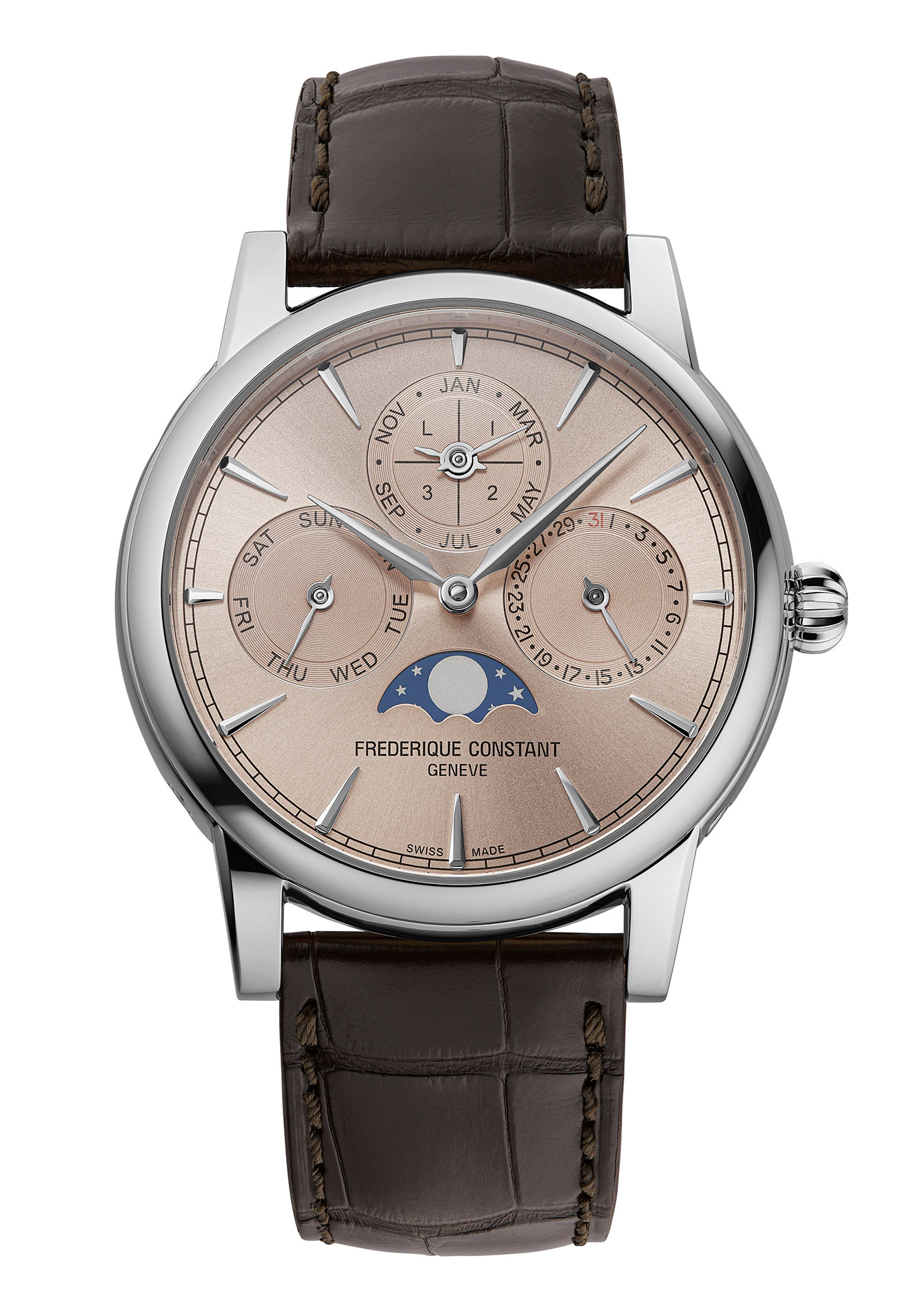 Classic Perpetual Calendar Manufacture hadir dengan tampilan yang lembut dan harmonis, menyuarakan kesederhanaan yang tidak pernah lekang oleh waktu. Jam ini menampilkan pelat jam dari warna favorit para kolektor, yaitu warna salmon dan dibalut dalam casing baja nirkarat yang kini hadir dengan diameter 40 milimeter. Jam tangan dari koleksi Classic terbaru ini menggunakan mesin jam kaliber Manufacture FC-776, kaliber ke-34 yang dikembangkan sendiri oleh produsen jam tangan asal Jenewa ini. Hadir dalam casing Klasik terbaru dari Frederique Constant dengan garis-garis yang lebih halus, lug yang lebih ramping, dan diameter yang lebih ringkas, menjadi sebuah cerminan prinsip-prinsip pembuatan jam tangan mewah bergaya vintage, dimana harmoni dan keanggunan diekspresikan dengan indah.