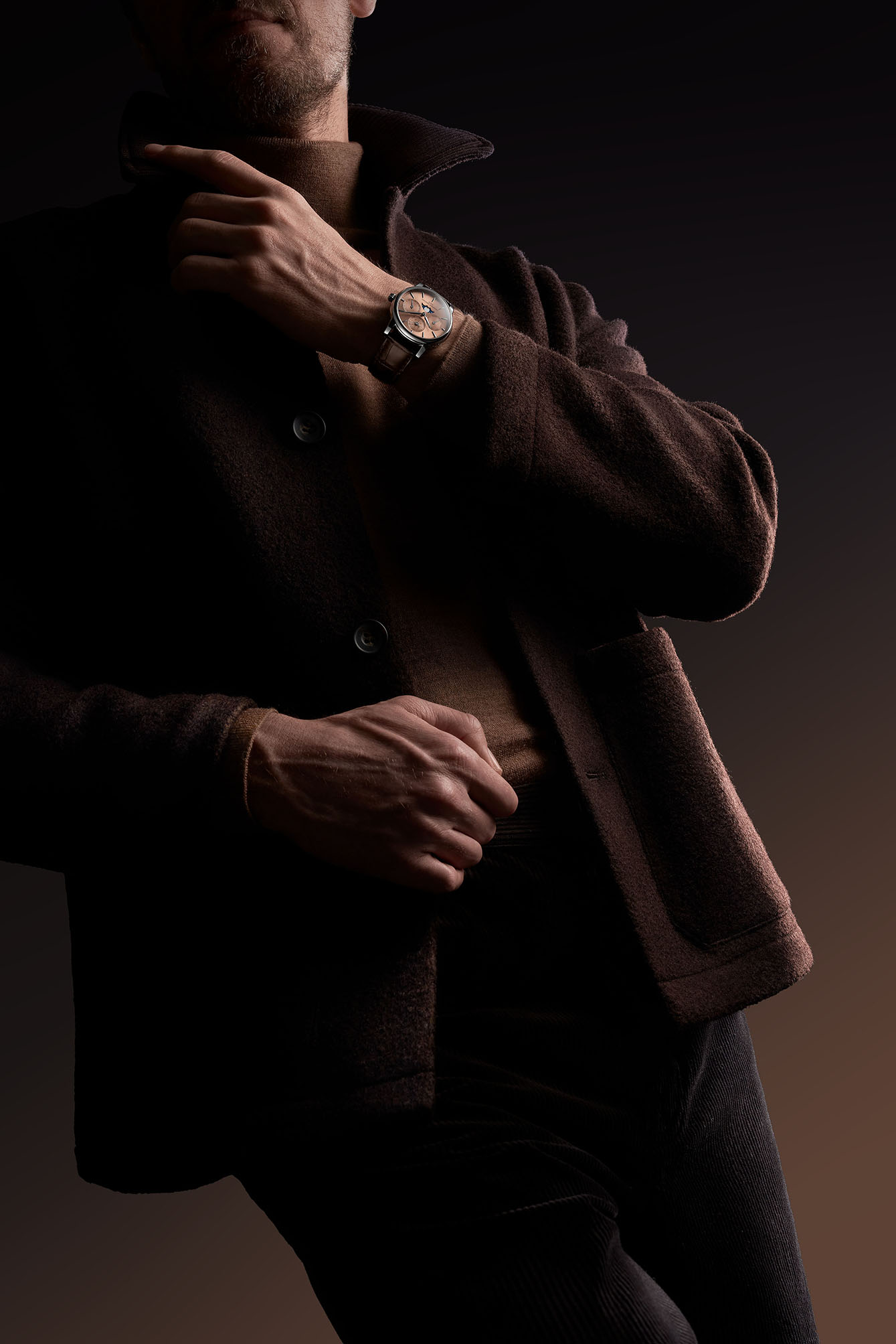 Tampilan pelat jam dengan warna salmon menawarkan keanggunan alami dari harmoni yang halus, begitu pula kedua jarum jam Dauphine yang dirakit dan dipoles dengan tangan; penanda jam kini juga lebih ramping, dan tersusun di sekitar jalur menit ‘pelat jam sektor’, yaitu gaya khas jam tangan vintage dari abad lalu. Dikombinasikan dengan angka jam dan menit, tampilan jam ini lugas dan minimalis, menyisakan ruang yang cukup untuk tiga tampilan kalender abadi pada latar belakang sunburst yang luas, bulan dan tahun kabisat pada pukul 12, hari pada pukul 9, dan tanggal pada pukul 3. Setiap penghitung sedikit berundak, menambahkan tekstur halus pada komposisi. Sentuhan akhir diberikan oleh Fase Bulan, dengan jendela khususnya sendiri pada pukul 6.