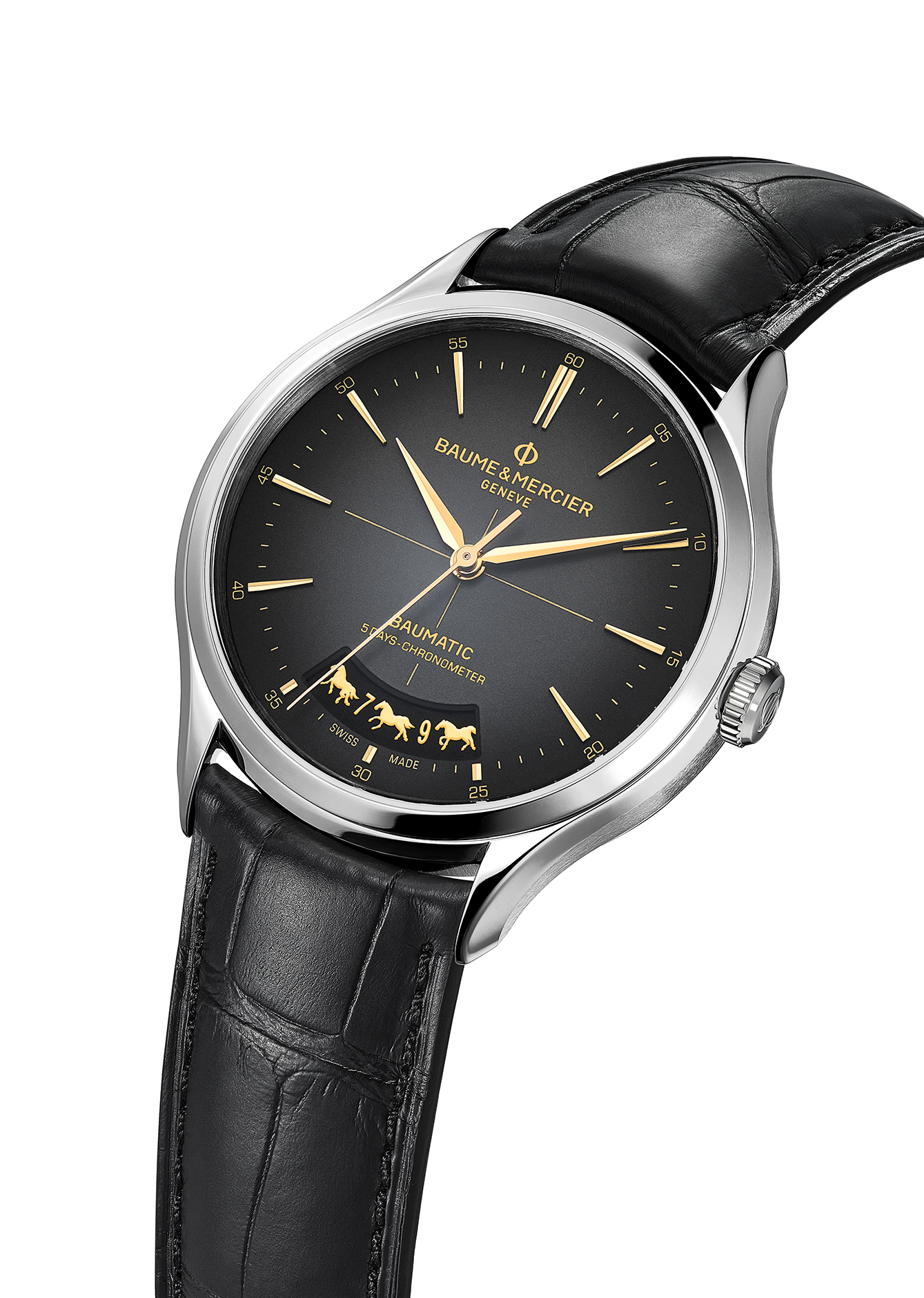 Bahasa desain yang mengelilingi animasi ini juga sama halusnya. Bagian dial dihiasi dengan indeks berlekuk serta jarum jam yang berbentuk alpha, dalam nuansa emas yang memberikan kontras hangat dan mewah terhadap latar belakang hitam abu-abu. Tali jam tangan dari kulit buaya hitam dengan jahitan abu-abu memperlihatkan lapisan dalam berwarna merah mencolok, seakan mewakili kebahagiaan dan kesuksesan. Mesin jam tangan ini ditenagai oleh Baumatic BM13-1975A, dengan sertifikasi COSC yang menawarkan ketahanan luar biasa terhadap medan magnet hingga 1.500 Gauss. Yang paling menonjol, jam ini memiliki cadangan daya lima hari (120 jam), memastikan jam ini tetap beroperasi bahkan jika anda meninggalkannya di atas meja selama akhir pekan. Pada penutup case belakang terukir siluet kuda jantan warna emas yang seolah-olah menembus kaca. Baume & Mercier berhasil menggabungkan ketelitian teknis dengan perayaan sebuah budaya. Harga: CHF 3.450 (sekitar IDR 75 juta).