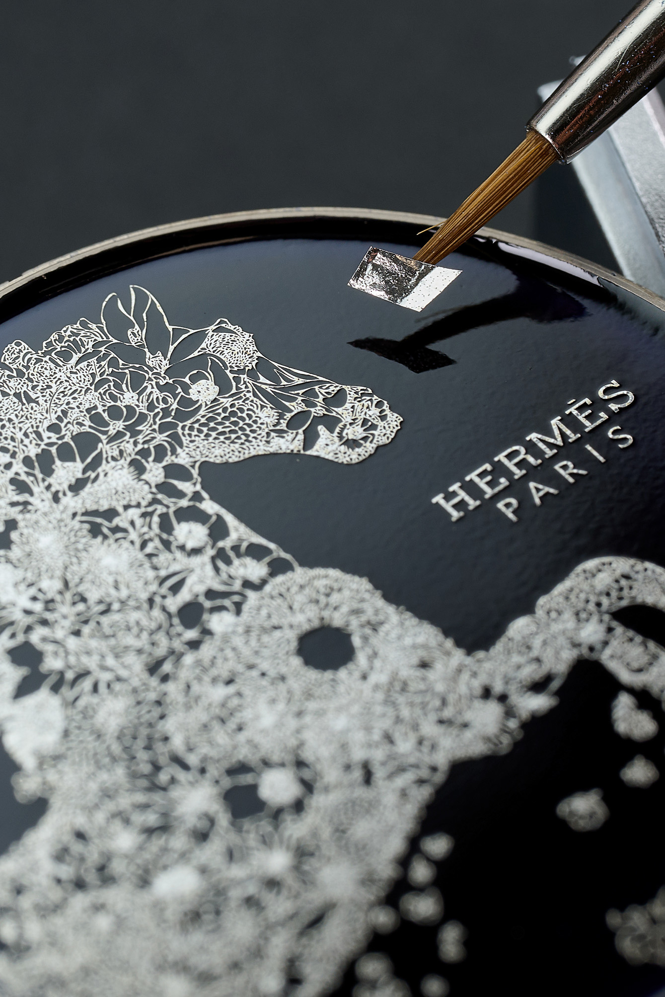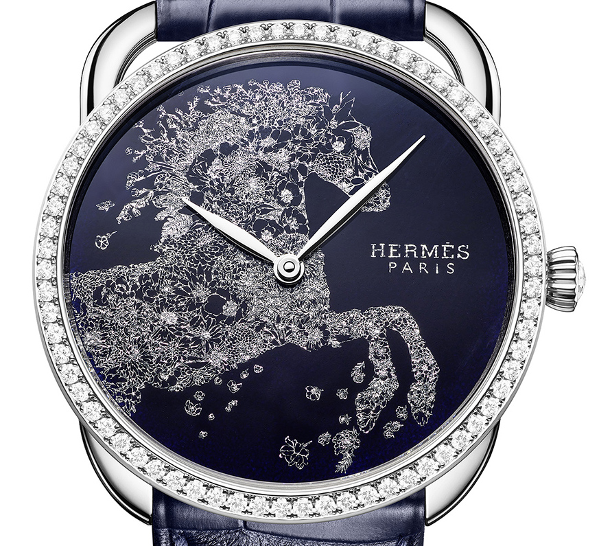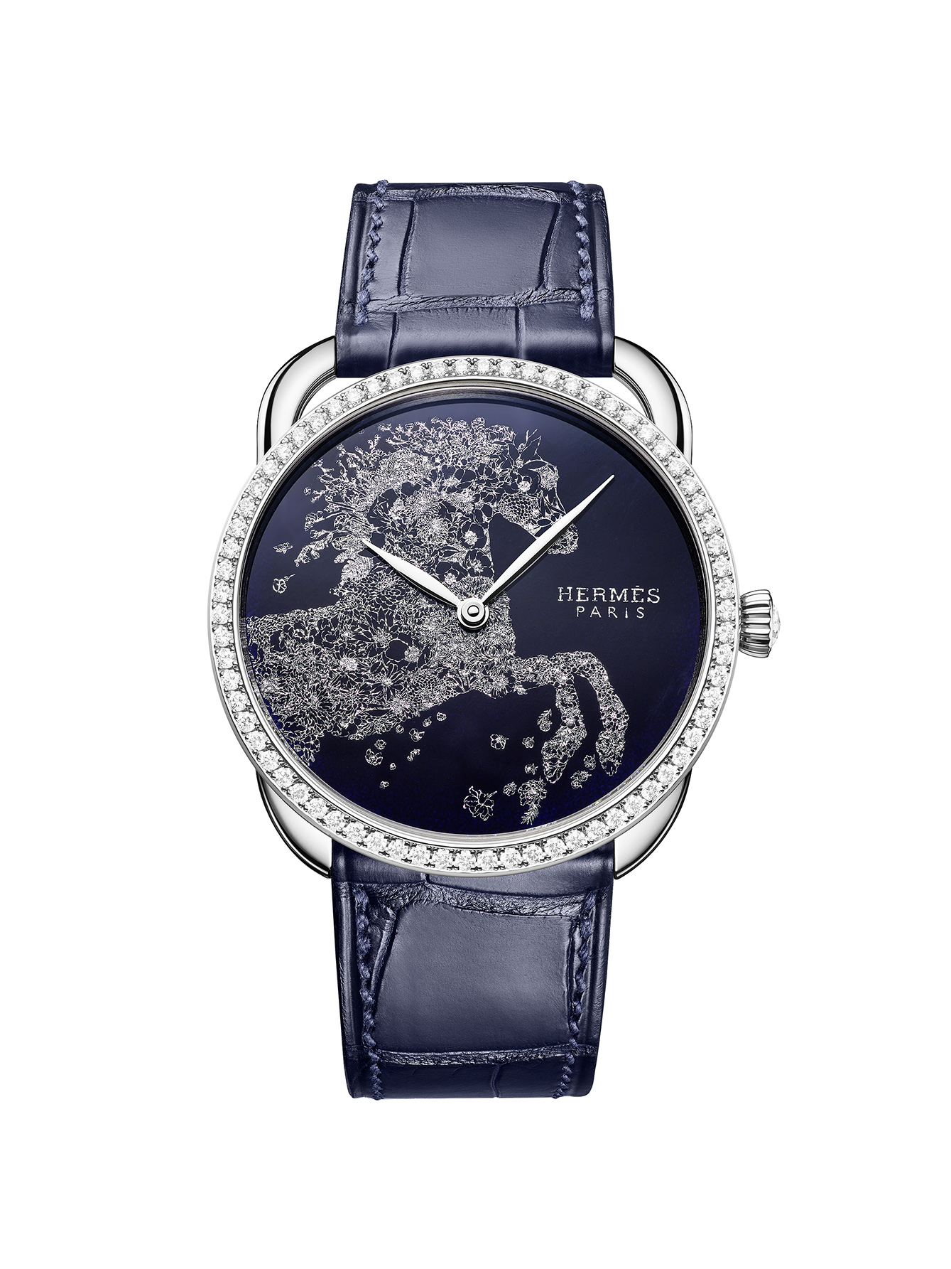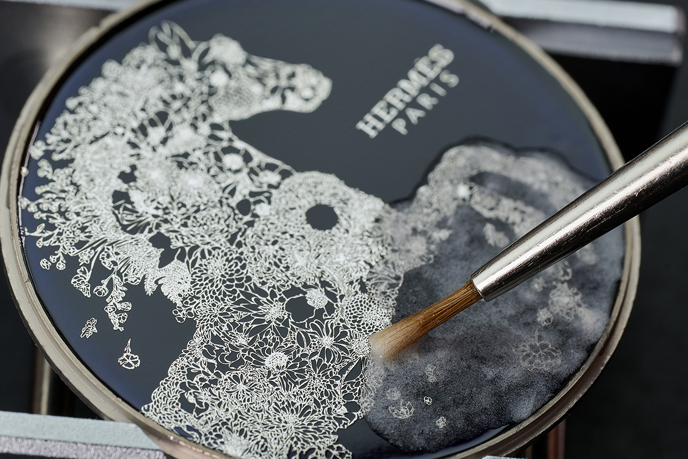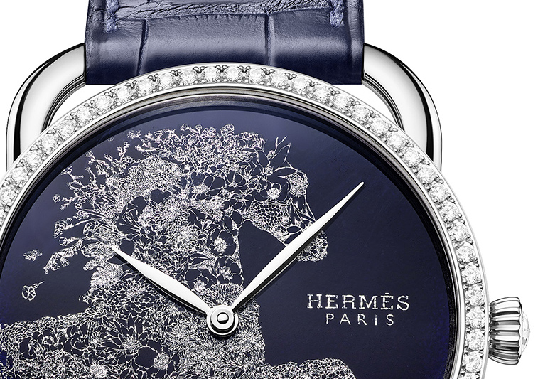 Untuk menciptakan motif tersebut, para pengrajin memulai dengan mengaplikasikan dasar enamel gelap menggunakan kuas, yang terbuat dari bubuk kaca berwarna yang telah digiling, dicampur minyak alami, dikeringkan, dan kemudian dipanggang dalam tungku untuk mengunci pigmen. Selanjutnya, bunga-bunga indah dibentuk dari lembaran perak itu ditempatkan di atas enamel dan disempurnakan dengan penambahan spangles kecil melalui beberapa proses pemanggangan bertahap. Dikapsulasikan ke dalam case emas putih berdiameter 38mm yang dihiasi 71 berlian, memberikan sentuhan kemewahan yang memukau. Didukung oleh mesin Manufacture Hermès H1912, jam tangan ini menggabungkan kecanggihan teknis yang presisi dengan keindahan estetika. Sebagai pelengkap, temali kulit buaya biru tua berfinis matte, yang dikerjakan sesuai keahlian Hermès dalam seni pengerjaan kulit. Hal ini menambah sentuhan akhir yang sempurna pada edisi terbatas ini, yang hanya tersedia dalam 24 buah.