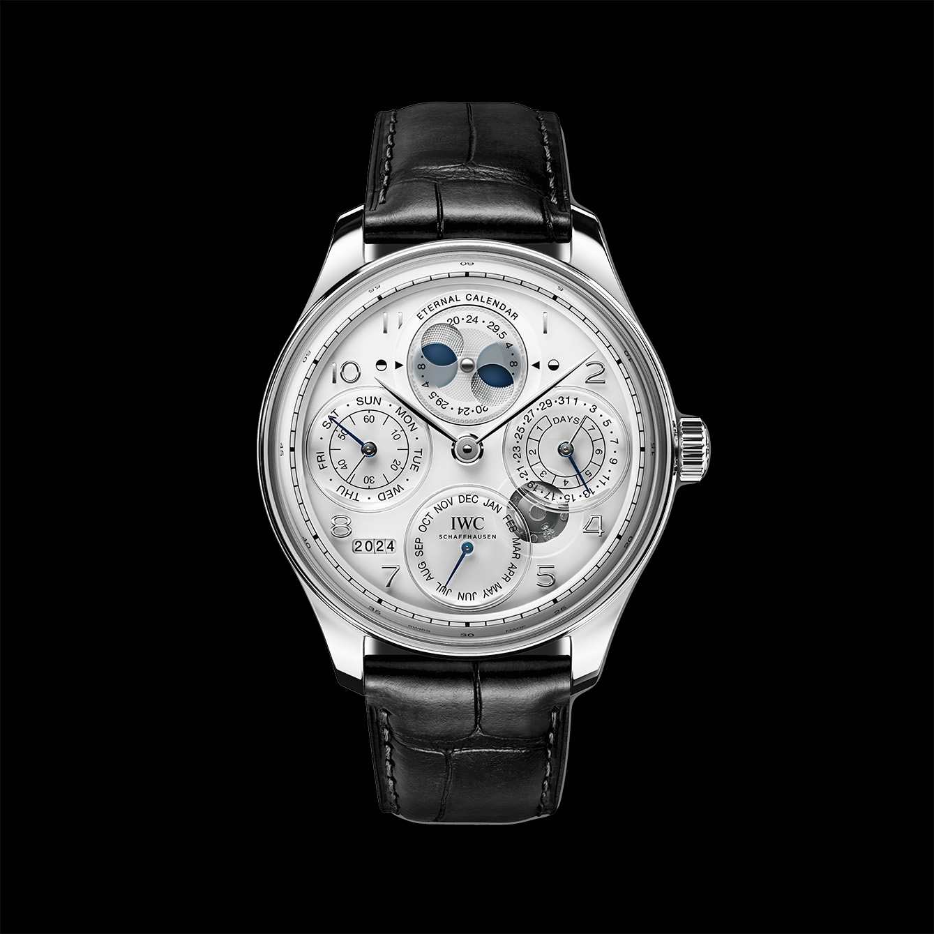 IWC Schaffhausen telah mengumpulkan banyak sekali keahlian dalam kalender mekanis sejak tahun 1980-an. Kalender abadi Kurt Klaus adalah yang pertama kali memiliki tampilan yang sepenuhnya tersinkronisasi satu sama lain dan dapat dimajukan hanya dengan menggunakan tombol jam. Kami telah mengembangkan desainnya yang mudah digunakan, selangkah lebih maju dan sekarang meluncurkan kalender abadi sekuler pertama kami. Kalender ini memiliki program mekanis yang mengenali panjang bulan yang berbeda dan menambahkan hari kabisat di akhir Februari setiap empat tahun. Namun, itu belum semuanya. Kalender ini juga memperhitungkan bahwa dalam rentang waktu 400 tahun, tiga tahun kabisat yang biasanya terjadi dalam kalender Gregorian dihilangkan. Portugieser Eternal Calendar menghilangkan tahun kabisat pada tahun yang habis dibagi 100, tetapi tetap menggunakannya untuk tahun yang habis dibagi 400. Ini dimungkinkan oleh modul abad yang roda paling lambatnya hanya menyelesaikan satu putaran setiap 400 tahun sekali.