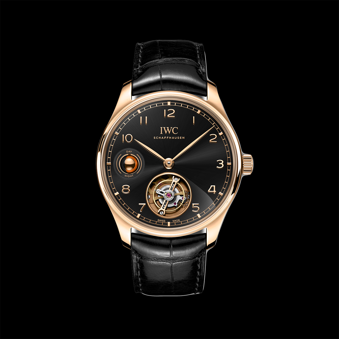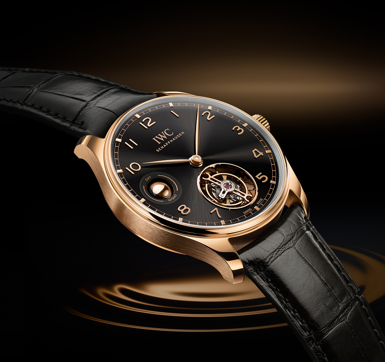 Ya, Portugieser Hand-Wound Tourbillon Day & Night. Tourbillon ini memiliki flying minute tourbillon pada pukul 6 dan berisi 56 bagian individual tetapi beratnya hanya 0,675 gram. Berkat penghenti tourbillon terintegrasi, Anda dapat menghentikan mekanisme sepenuhnya dan menyetel jam dengan presisi hingga detik terakhir. Lapisan berlian pada garpu palet dan roda lepas mengurangi gesekan secara signifikan. Teknologi Diamond Shell® ini, demikian kami menyebutnya, membantu meningkatkan aliran energi dalam mesin jam dan menciptakan cadangan daya 84 jam yang sangat besar. Keunikan lain adalah tampilan siang/malam yang tidak biasa pada pukul 9.