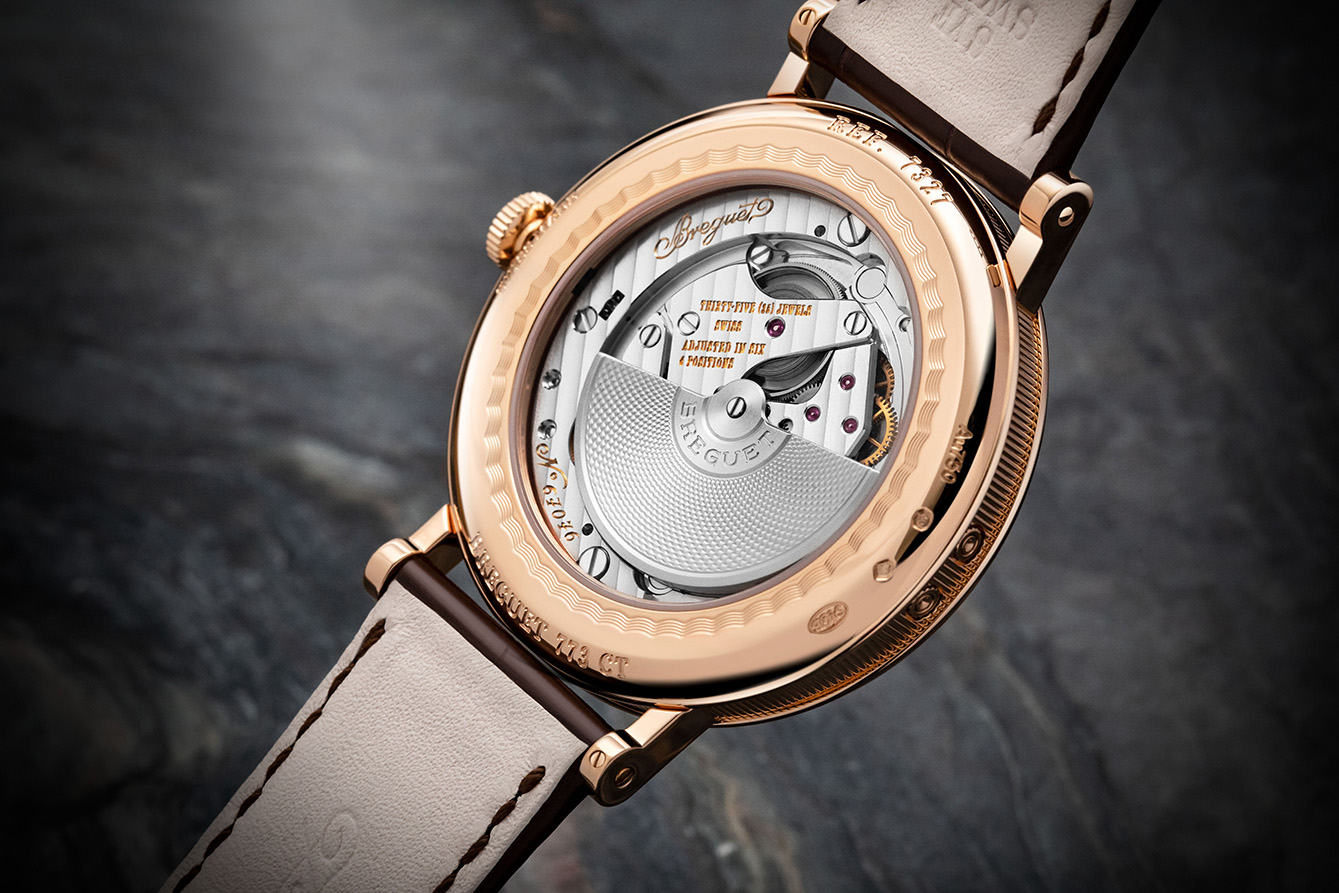 Waktu diatur melalui tombol jam yang terletak pada pukul 3. Mesin jam yang kompleks ini bisa dinikmati lewat caseback kaca safir transparan yang memamerkan keahlian tingkat tinggi dari Breguet dalam menghias movement.