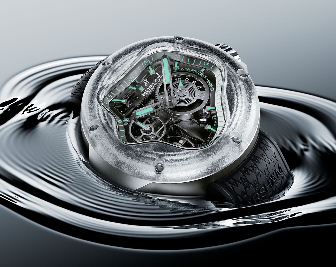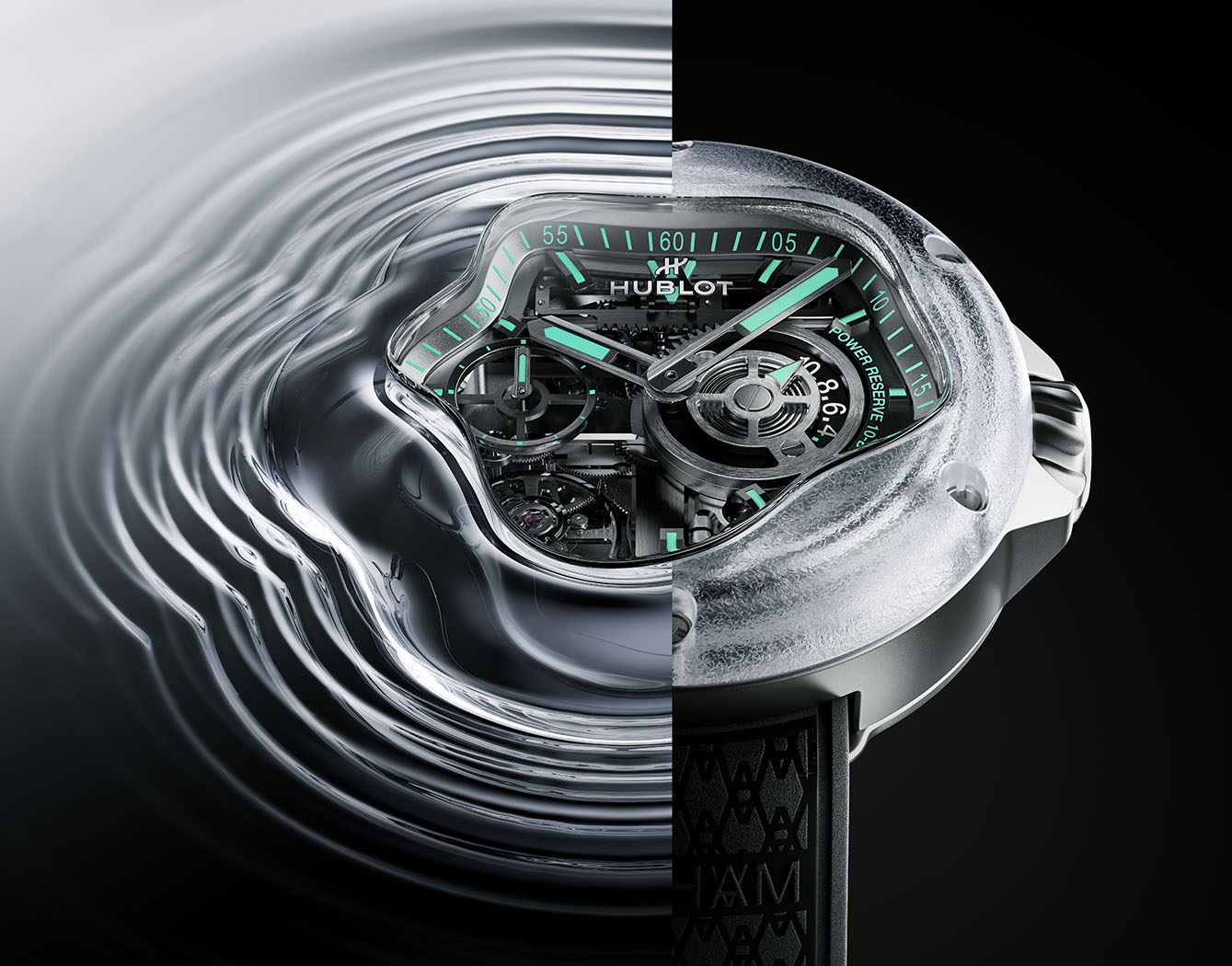 Terinspirasi dari bentuk dan gerak air, karya ini mewujudkan kelenturan dan dinamika dalam konstruksi yang menyerupai cipratan yang membeku di udara. Jam tangan ini bukan hanya hasil rancangan estetis, tetapi juga sebuah percakapan antara keabadian dan kefanaan, antara transparansi dan ketegangan yang dirangkai dengan presisi dan imajinasi oleh dua dunia berbeda tapi mampu saling melengkapi.