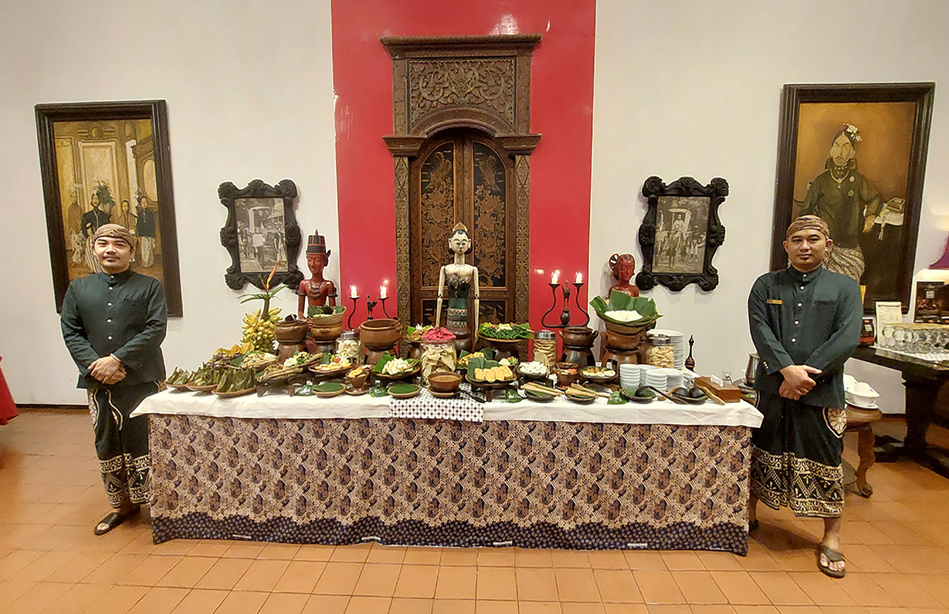 Sebuah stan bergaya tradisional Jawa menyajikan kudapan dan kue tradisional berikut pilihan teh, kopi, atau minuman herbal lokal yang diurus oleh Mbah Man, asal Jawa yang berusia lebih dari 80 tahun dan telah bekerja di hotel itu sejak masih muda.
